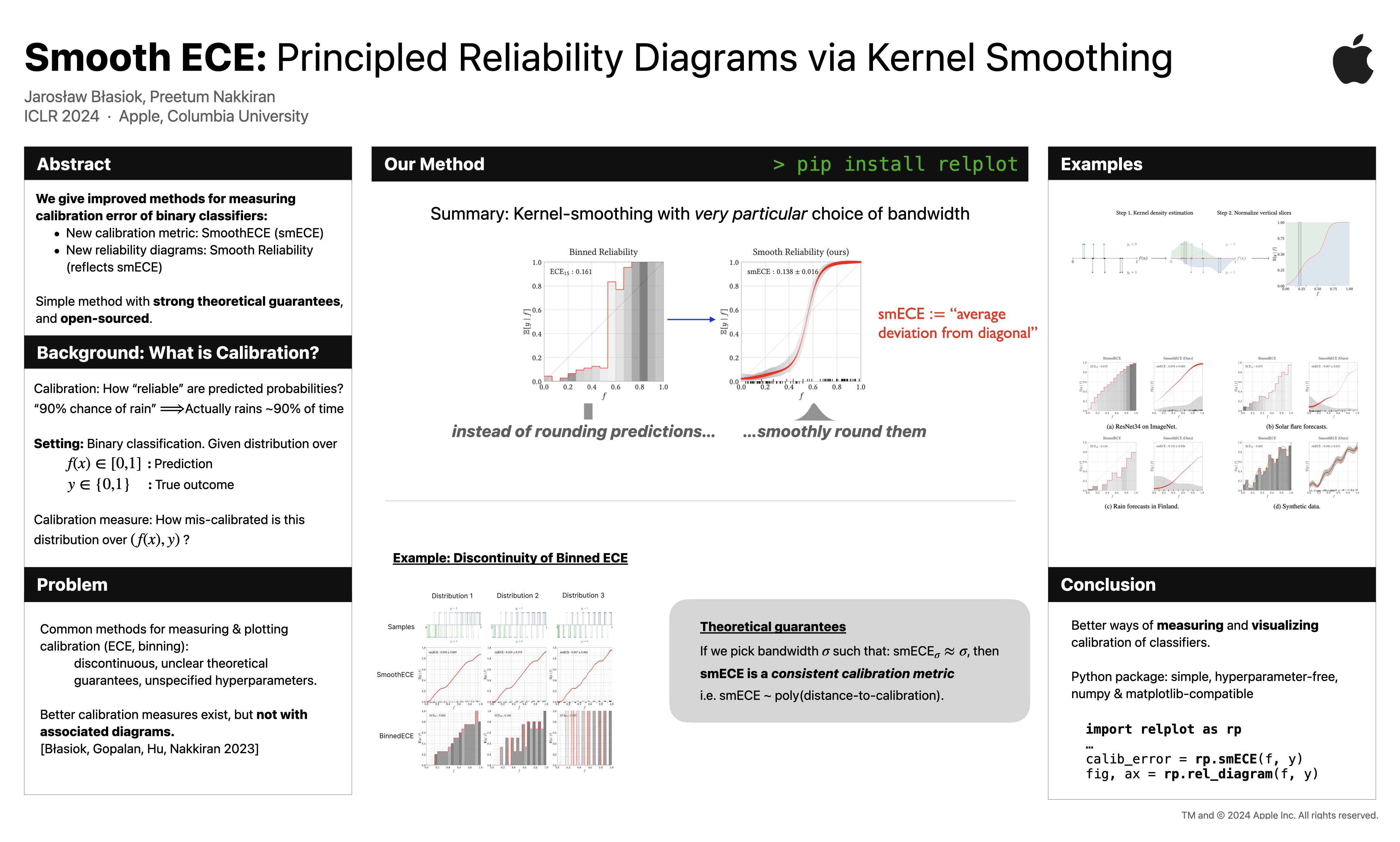 Calibration measures and reliability diagrams are two fundamental tools for measuring and interpreting the calibration of probabilistic predictors. Calibration measures quantify the degree of miscalibration, and reliability diagrams visualize the structure of this miscalibration. However, the most common constructions of reliability diagrams and calibration measures --- binning and ECE --- both suffer from well-known flaws (e.g. discontinuity). We show that a simple modification fixes both constructions: first smooth the observations using an RBF kernel, then compute the Expected Calibration Error (ECE) of this smoothed function. We prove that with a careful choice of bandwidth, this method yields a calibration measure that is well-behaved in the sense of (Blasiok, Gopalan, Hu, and Nakkiran 2023) --- a consistent calibration measure. We call this measure the SmoothECE. Moreover, the reliability diagram obtained from this smoothed function visually encodes the SmoothECE, just as binned reliability diagrams encode the BinnedECE. We also release a Python package with simple, hyperparameter-free methods for measuring and plotting calibration: "pip install relplot."Code at: https://github.com/apple/ml-calibration