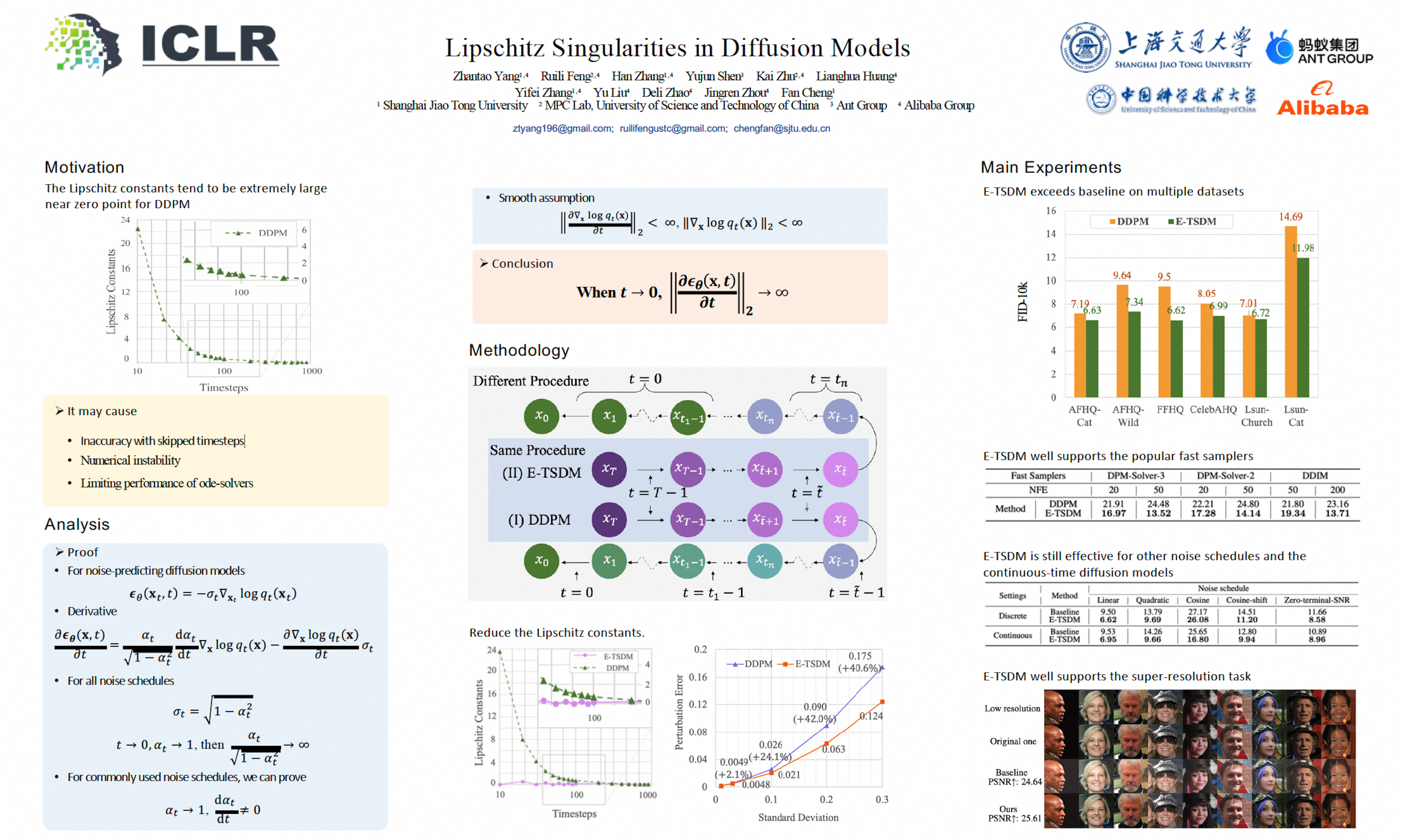 Diffusion models, which employ stochastic differential equations to sample images through integrals, have emerged as a dominant class of generative models. However, the rationality of the diffusion process itself receives limited attention, leaving the question of whether the problem is well-posed and well-conditioned. In this paper, we uncover a vexing propensity of diffusion models: they frequently exhibit the infinite Lipschitz near the zero point of timesteps. We provide theoretical proofs to illustrate the presence of infinite Lipschitz constants and empirical results to confirm it. The Lipschitz singularities pose a threat to the stability and accuracy during both the training and inference processes of diffusion models. Therefore, the mitigation of Lipschitz singularities holds great potential for enhancing the performance of diffusion models. To address this challenge, we propose a novel approach, dubbed E-TSDM, which alleviates the Lipschitz singularities of the diffusion model near the zero point. Remarkably, our technique yields a substantial improvement in performance. Moreover, as a byproduct of our method, we achieve a dramatic reduction in the Fréchet Inception Distance of acceleration methods relying on network Lipschitz, including DDIM and DPM-Solver, by over 33\%. Extensive experiments on diverse datasets validate our theory and method. Our work may advance the understanding of the general diffusion process, and also provide insights for the design of diffusion models.