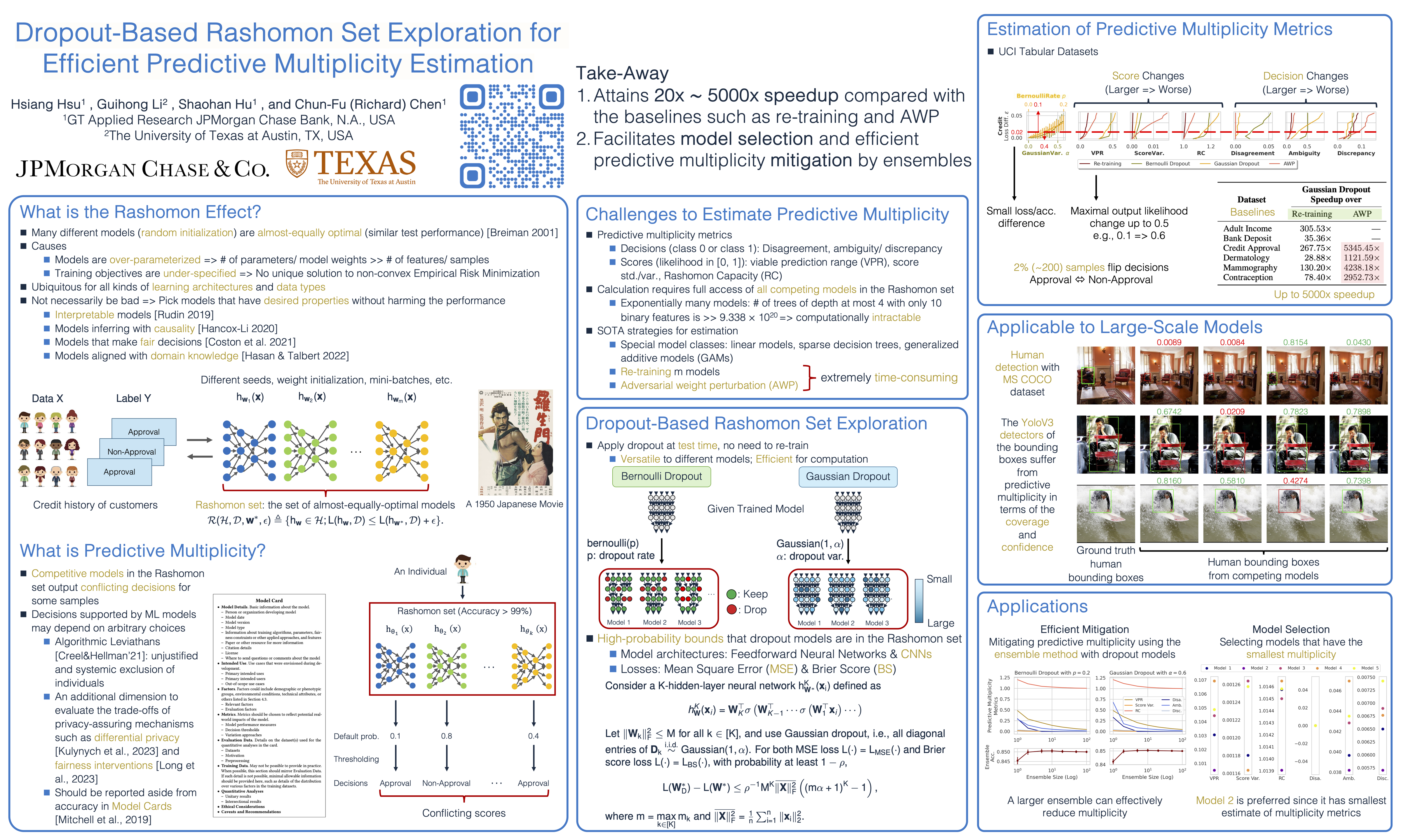 Predictive multiplicity refers to the phenomenon in which classification tasks may admit multiple competing models that achieve almost-equally-optimal performance, yet generate conflicting outputs for individual samples.This presents significant concerns, as it can potentially result in systemic exclusion, inexplicable discrimination, and unfairness in practical applications.Measuring and mitigating predictive multiplicity, however, is computationally challenging due to the need to explore all such almost-equally-optimal models, known as the Rashomon set, in potentially huge hypothesis spaces. To address this challenge, we propose a novel framework that utilizes dropout techniques for exploring models in the Rashomon set.We provide rigorous theoretical derivations to connect the dropout parameters to properties of the Rashomon set, and empirically evaluate our framework through extensive experimentation.Numerical results show that our technique consistently outperforms baselines in terms of the effectiveness of predictive multiplicity metric estimation, with runtime speedup up to $20\times \sim 5000\times$.With efficient Rashomon set exploration and metric estimation, mitigation of predictive multiplicity is then achieved through dropout ensemble and model selection.