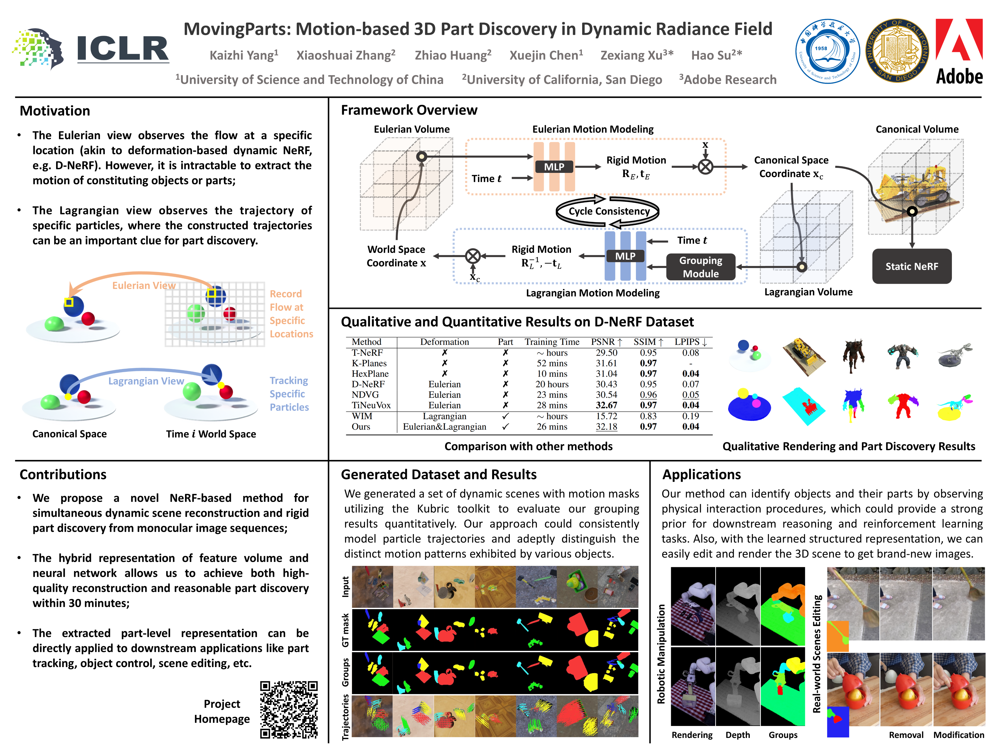 We present MovingParts, a NeRF-based method for dynamic scene reconstruction and part discovery. We consider motion as an important cue for identifying parts, that all particles on the same part share the common motion pattern. From the perspective of fluid simulation, existing deformation-based methods for dynamic NeRF can be seen as parameterizing the scene motion under the Eulerian view, i.e., focusing on specific locations in space through which the fluid flows as time passes. However, it is intractable to extract the motion of constituting objects or parts using the Eulerian view representation. In this work, we introduce the dual Lagrangian view and enforce representations under the Eulerian/Lagrangian views to be cycle-consistent. Under the Lagrangian view, we parameterize the scene motion by tracking the trajectory of particles on objects. The Lagrangian view makes it convenient to discover parts by factorizing the scene motion as a composition of part-level rigid motions. Experimentally, our method can achieve fast and high-quality dynamic scene reconstruction from even a single moving camera, and the induced part-based representation allows direct applications of part tracking, animation, 3D scene editing, etc.