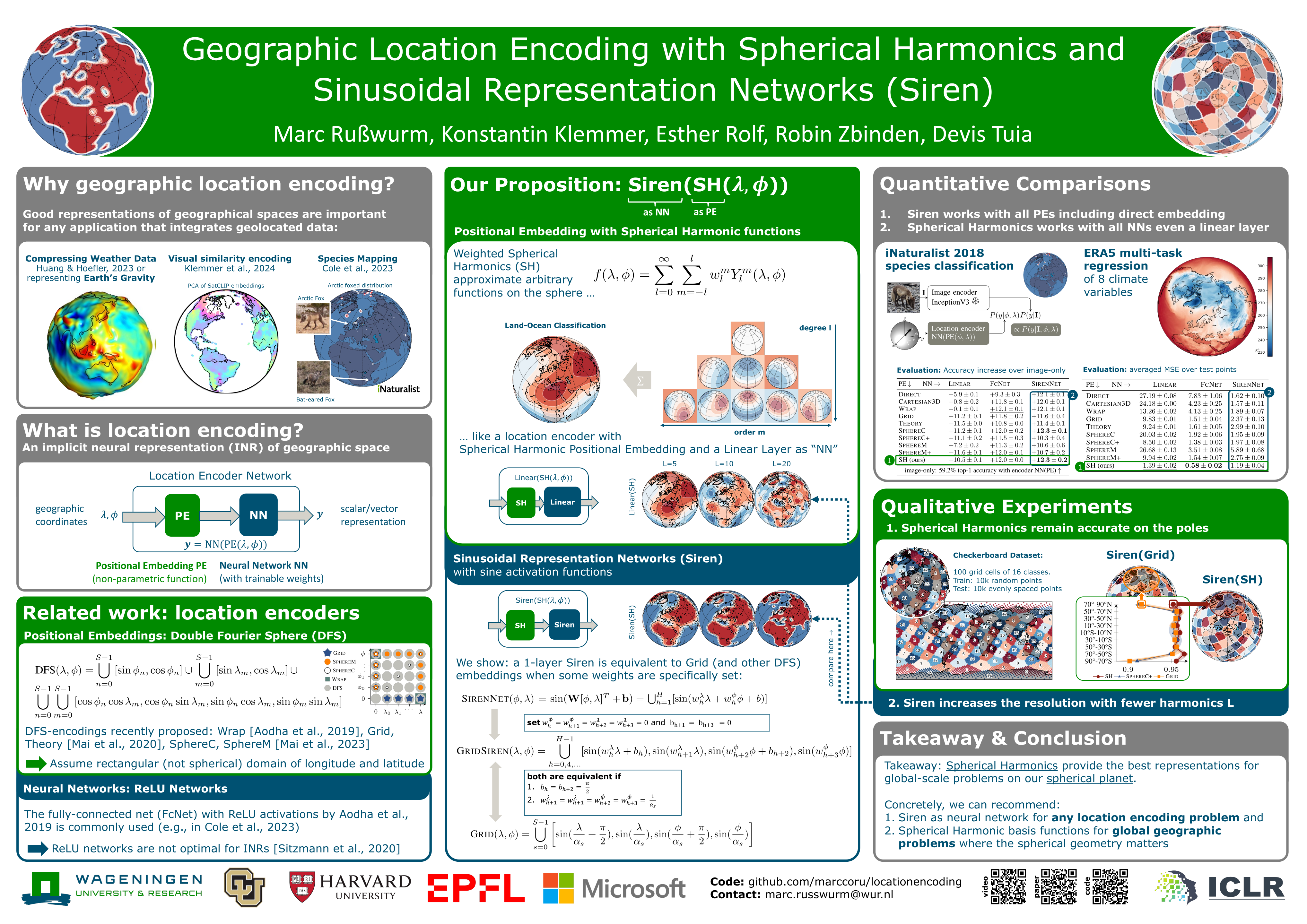 Geographic Location Encoding with Spherical Harmonics and Sinusoidal Representation Networks