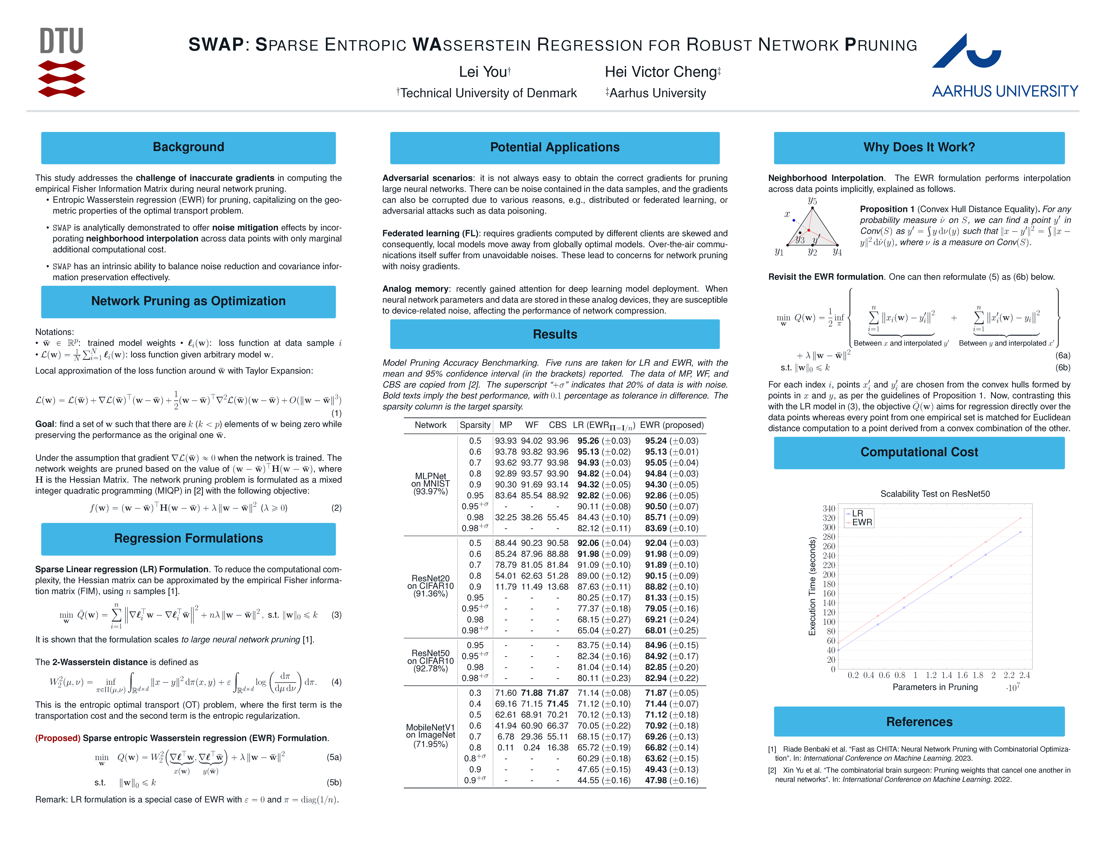 This study addresses the challenge of inaccurate gradients in computing the empirical Fisher Information Matrix during network pruning. We introduce SWAP, a formulation of Entropic Wasserstein regression (EWR) for network pruning, capitalizing on the geometric properties of the optimal transport problem. The “swap” of the commonly used linear regression with the EWR in optimization is analytically demonstrated to offer noise mitigation effects by incorporating neighborhood interpolation across data points with only marginal additional computational cost. The unique strength of SWAP is its intrinsic ability to balance noise reduction and covariance information preservation effectively. Extensive experiments performed on various networks and datasets show comparable performance of SWAP with state-of-the-art (SoTA) network pruning algorithms. Our proposed method outperforms the SoTA when the network size or the target sparsity is large, the gain is even larger with the existence of noisy gradients, possibly from noisy data, analog memory, or adversarial attacks. Notably, our proposed method achieves a gain of 6% improvement in accuracy and 8% improvement in testing loss for MobileNetV1 with less than one-fourth of the network parameters remaining.