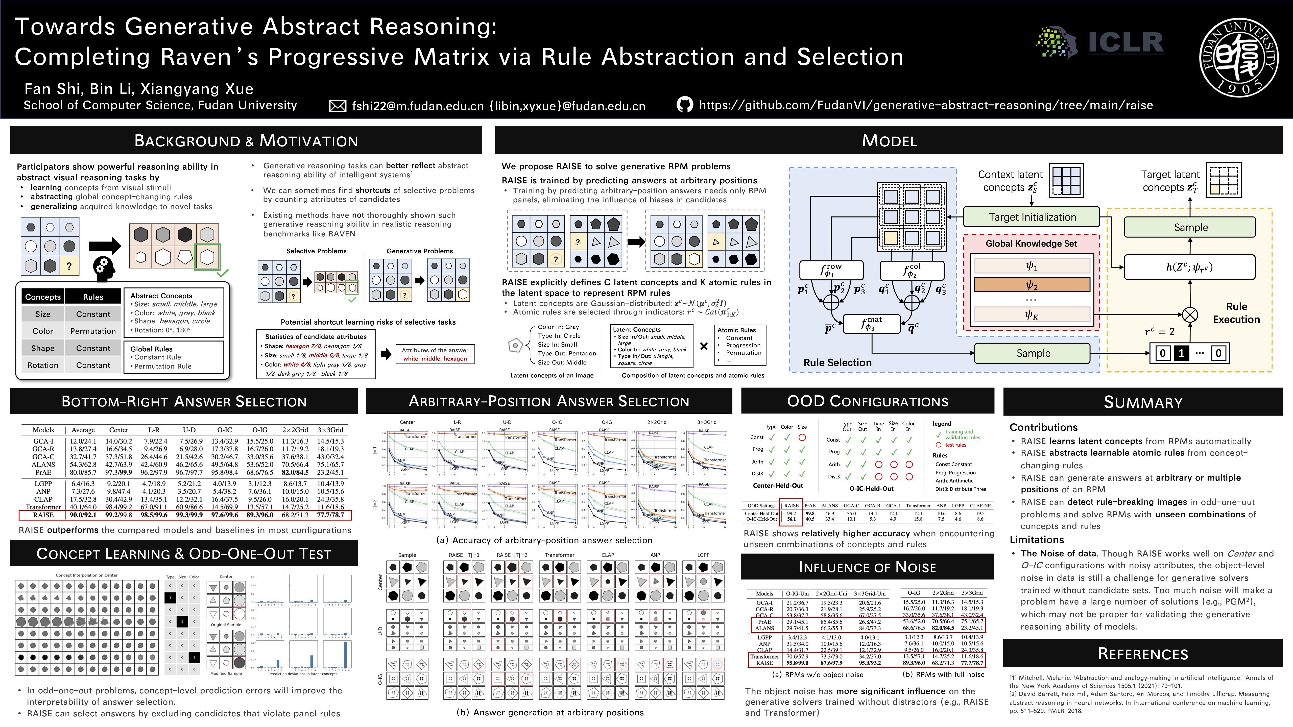 Endowing machines with abstract reasoning ability has been a long-term research topic in artificial intelligence. Raven's Progressive Matrix (RPM) is widely used to probe abstract visual reasoning in machine intelligence, where models will analyze the underlying rules and select one image from candidates to complete the image matrix. Participators of RPM tests can show powerful reasoning ability by inferring and combining attribute-changing rules and imagining the missing images at arbitrary positions of a matrix. However, existing solvers can hardly manifest such an ability in realistic RPM tests. In this paper, we propose a deep latent variable model for answer generation problems through Rule AbstractIon and SElection (RAISE). RAISE can encode image attributes into latent concepts and abstract atomic rules that act on the latent concepts. When generating answers, RAISE selects one atomic rule out of the global knowledge set for each latent concept to constitute the underlying rule of an RPM. In the experiments of bottom-right and arbitrary-position answer generation, RAISE outperforms the compared solvers in most configurations of realistic RPM datasets. In the odd-one-out task and two held-out configurations, RAISE can leverage acquired latent concepts and atomic rules to find the rule-breaking image in a matrix and handle problems with unseen combinations of rules and attributes.