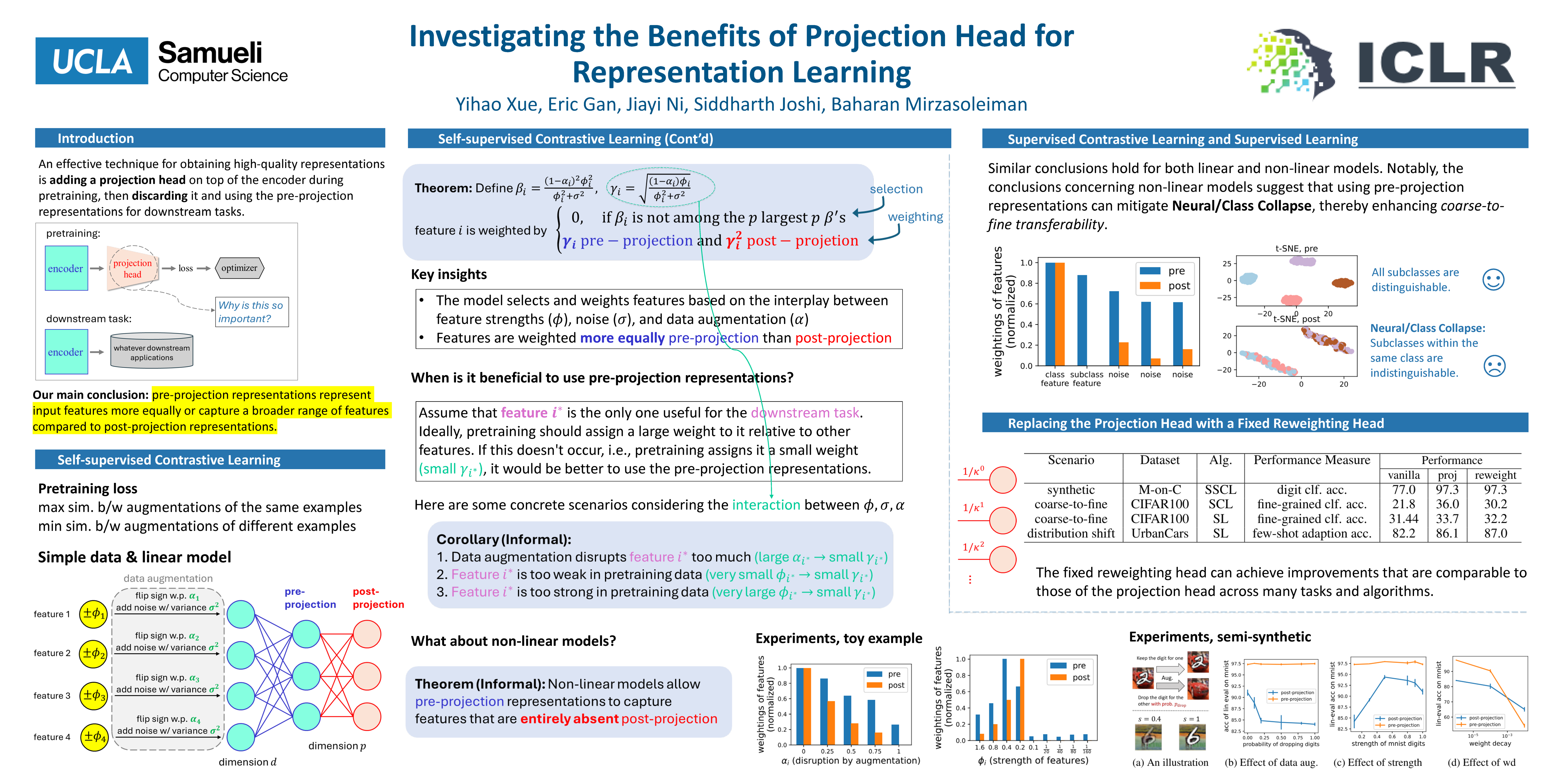 An effective technique for obtaining high-quality representations is adding a projection head on top of the encoder during training, then discarding it and using the pre-projection representations. Despite its proven practical effectiveness, the reason behind the success of this technique is poorly understood. The pre-projection representations are not directly optimized by the loss function, raising the question: what makes them better? In this work, we provide a rigorous theoretical answer to this question. We start by examining linear models trained with self-supervised contrastive loss. We reveal that the implicit bias of training algorithms leads to layer-wise progressive feature weighting, where features become increasingly unequal as we go deeper into the layers. Consequently, lower layers tend to have more normalized and less specialized representations. We theoretically characterize scenarios where such representations are more beneficial, highlighting the intricate interplay between data augmentation and input features. Additionally, we demonstrate that introducing non-linearity into the network allows lower layers to learn features that are completely absent in higher layers. Finally, we show how this mechanism improves the robustness in supervised contrastive learning and supervised learning. We empirically validate our results through various experiments on CIFAR-10/100, UrbanCars and shifted versions of ImageNet. We also introduce a potential alternative to projection head, which offers a more interpretable and controllable design.