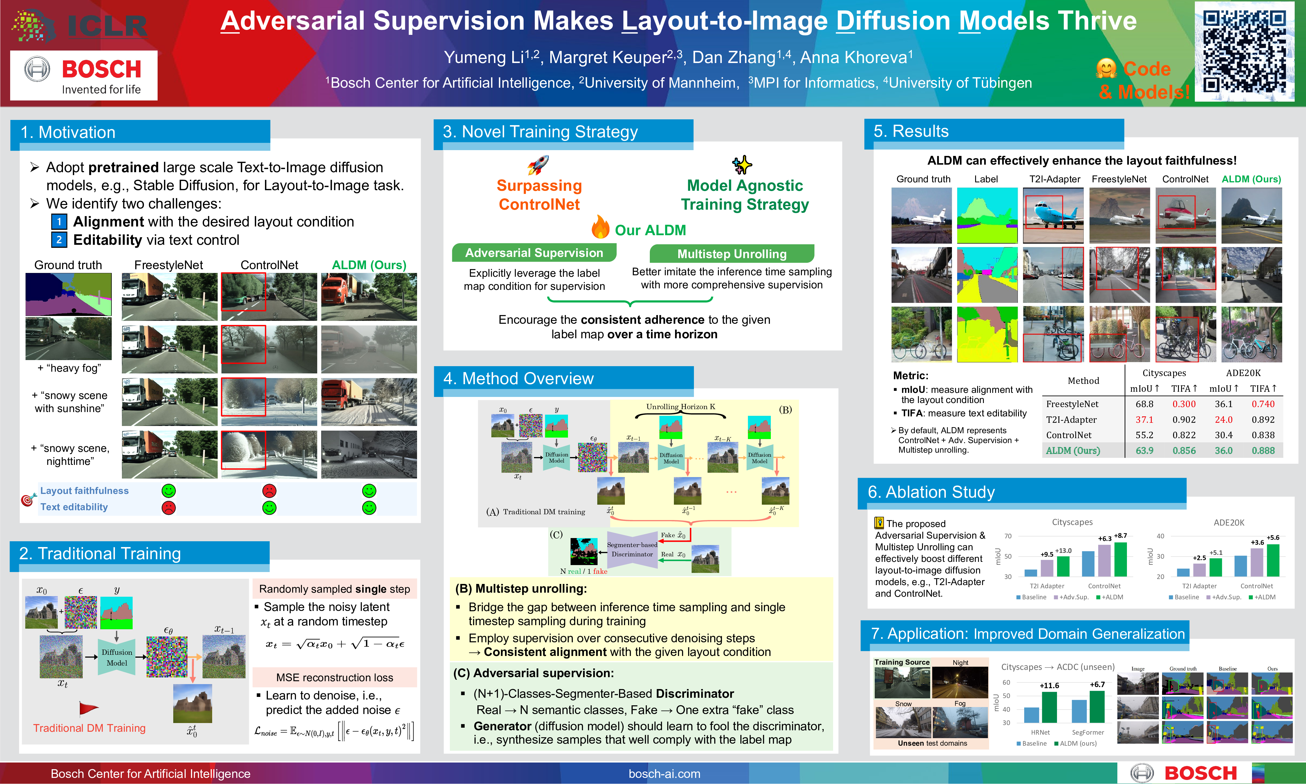 Despite the recent advances in large-scale diffusion models, little progress has been made on the layout-to-image (L2I) synthesis task. Current L2I models either suffer from poor editability via text or weak alignment between the generated image and the input layout. This limits their usability in practice. To mitigate this, we propose to integrate adversarial supervision into the conventional training pipeline of L2I diffusion models (ALDM). Specifically, we employ a segmentation-based discriminator which provides explicit feedback to the diffusion generator on the pixel-level alignment between the denoised image and the input layout. To encourage consistent adherence to the input layout over the sampling steps, we further introduce the multistep unrolling strategy. Instead of looking at a single timestep, we unroll a few steps recursively to imitate the inference process, and ask the discriminator to assess the alignment of denoised images with the layout over a certain time window. Our experiments show that ALDM enables layout faithfulness of the generated images, while allowing broad editability via text prompts. Moreover, we showcase its usefulness for practical applications: by synthesizing target distribution samples via text control, we improve domain generalization of semantic segmentation models by a large margin (~12 mIoU points).