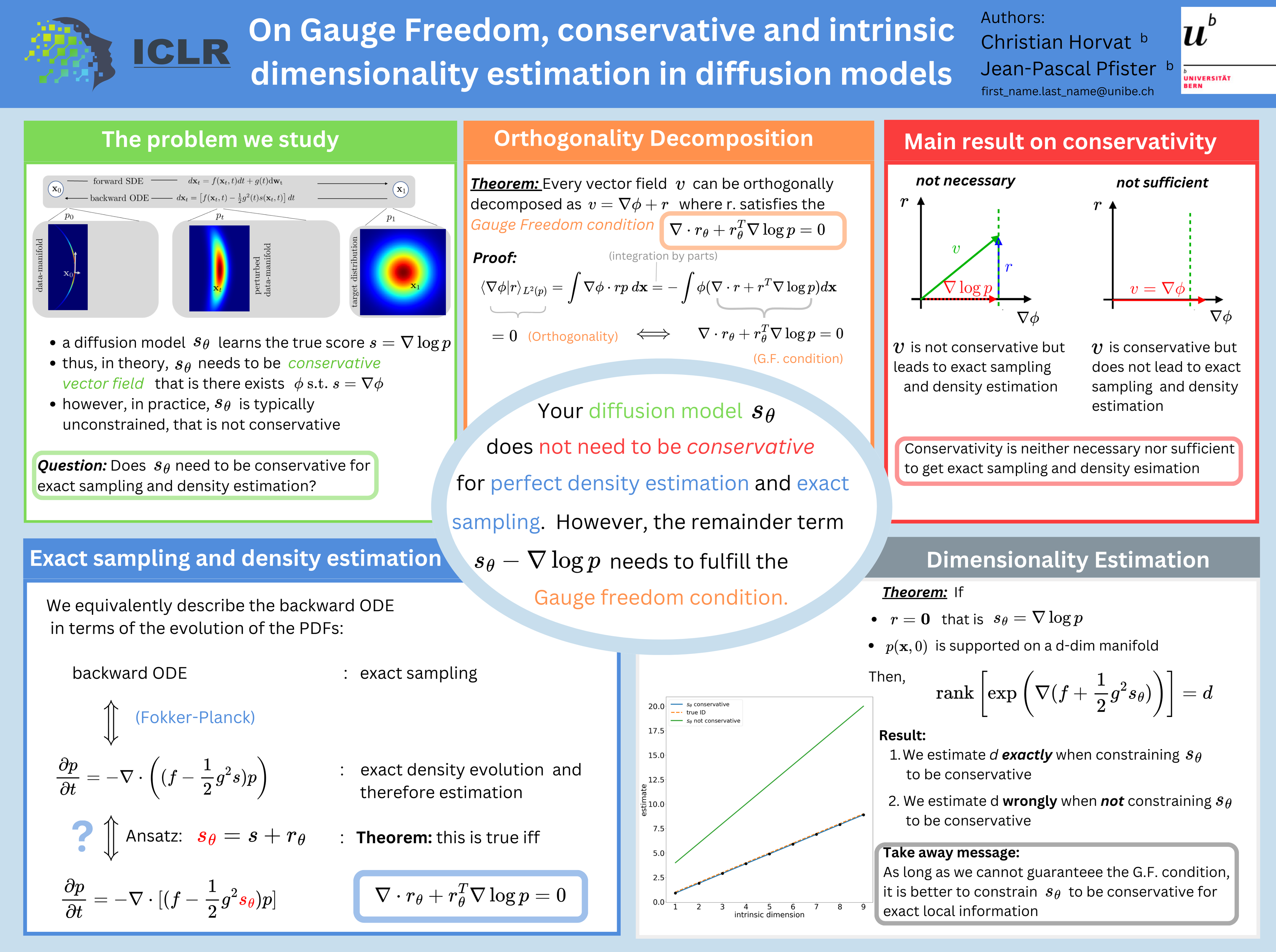 Diffusion models are generative models that have recently demonstrated impressive performances in terms of sampling quality and density estimation in high dimensions. They rely on a forward continuous diffusion process and a backward continuous denoising process, which can be described by a time-dependent vector field and is used as a generative model. In the original formulation of the diffusion model, this vector field is assumed to be the score function (i.e. it is the gradient of the log-probability at a given time in the diffusion process). Curiously, on the practical side, most studies on diffusion models implement this vector field as a neural network function and do not constrain it be the gradient of some energy function (that is, most studies do not constrain the vector field to be conservative). Even though some studies investigated empirically whether such a constraint will lead to a performance gain, they lead to contradicting results and failed to provide analytical results. Here, we provide three analytical results regarding the extent of the modeling freedom of this vector field. {Firstly, we propose a novel decomposition of vector fields into a conservative component and an orthogonal component which satisfies a given (gauge) freedom. Secondly, from this orthogonal decomposition, we show that exact density estimation and exact sampling is achieved when the conservative component is exactly equals to the true score and therefore conservativity is neither necessary nor sufficient to obtain exact density estimation and exact sampling. Finally, we show that when it comes to inferring local information of the data manifold, constraining the vector field to be conservative is desirable.