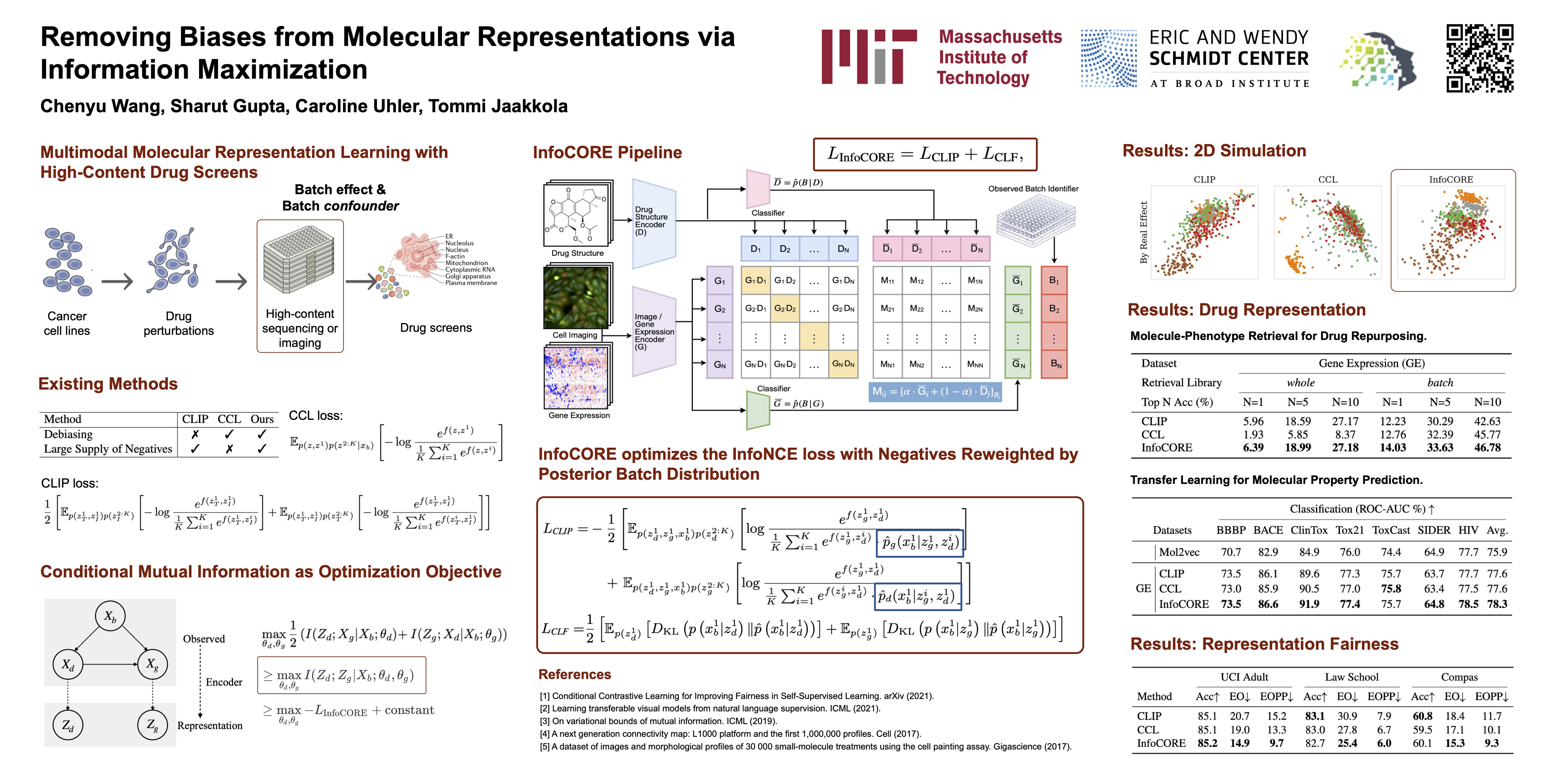 High-throughput drug screening -- using cell imaging or gene expression measurements as readouts of drug effect -- is a critical tool in biotechnology to assess and understand the relationship between the chemical structure and biological activity of a drug. Since large-scale screens have to be divided into multiple experiments, a key difficulty is dealing with batch effects, which can introduce systematic errors and non-biological associations in the data. We propose InfoCORE, an Information maximization approach for COnfounder REmoval, to effectively deal with batch effects and obtain refined molecular representations. InfoCORE establishes a variational lower bound on the conditional mutual information of the latent representations given a batch identifier. It adaptively reweights samples to equalize their implied batch distribution. Extensive experiments on drug screening data reveal InfoCORE's superior performance in a multitude of tasks including molecular property prediction and molecule-phenotype retrieval. Additionally, we show results for how InfoCORE offers a versatile framework and resolves general distribution shifts and issues of data fairness by minimizing correlation with spurious features or removing sensitive attributes.