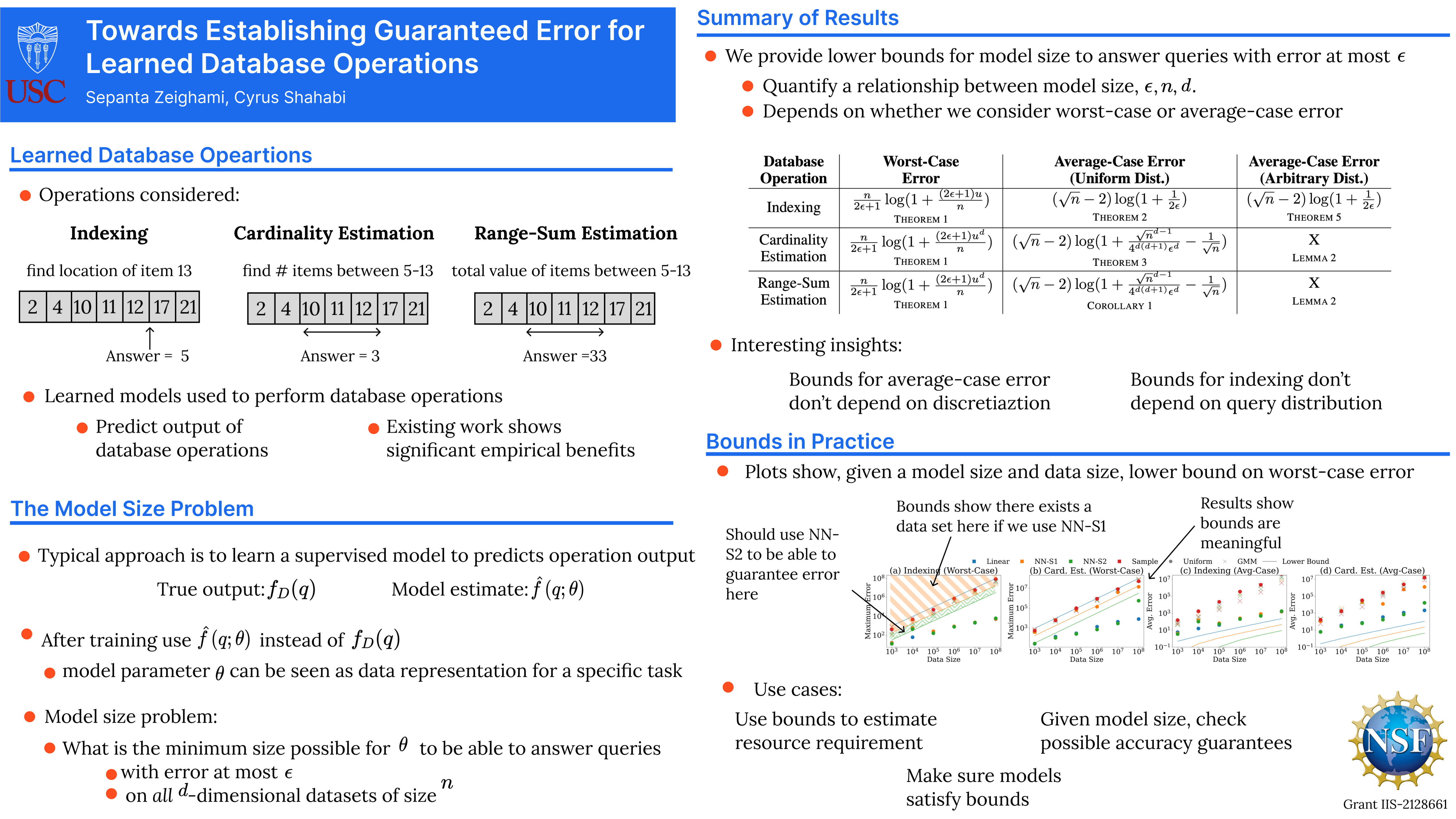 Machine learning models have demonstrated substantial performance enhancements over non-learned alternatives in various fundamental data management operations, including indexing (locating items in an array), cardinality estimation (estimating the number of matching records in a database), and range-sum estimation (estimating aggregate attribute values for query-matched records). However, real-world systems frequently favor less efficient non-learned methods due to their ability to offer (worst-case) error guarantees — an aspect where learned approaches often fall short. The primary objective of these guarantees is to ensure system reliability, ensuring that the chosen approach consistently delivers the desired level of accuracy across all databases. In this paper, we embark on the first theoretical study of such guarantees for learned methods, presenting the necessary conditions for such guarantees to hold when using machine learning to perform indexing, cardinality estimation and range-sum estimation. Specifically, we present the first known lower bounds on the model size required to achieve the desired accuracy for these three key database operations. Our results bound the required model size for given average and worst-case errors in performing database operations, serving as the first theoretical guidelines governing how model size must change based on data size to be able to guarantee an accuracy level. More broadly, our established guarantees pave the way for the broader adoption and integration of learned models into real-world systems.