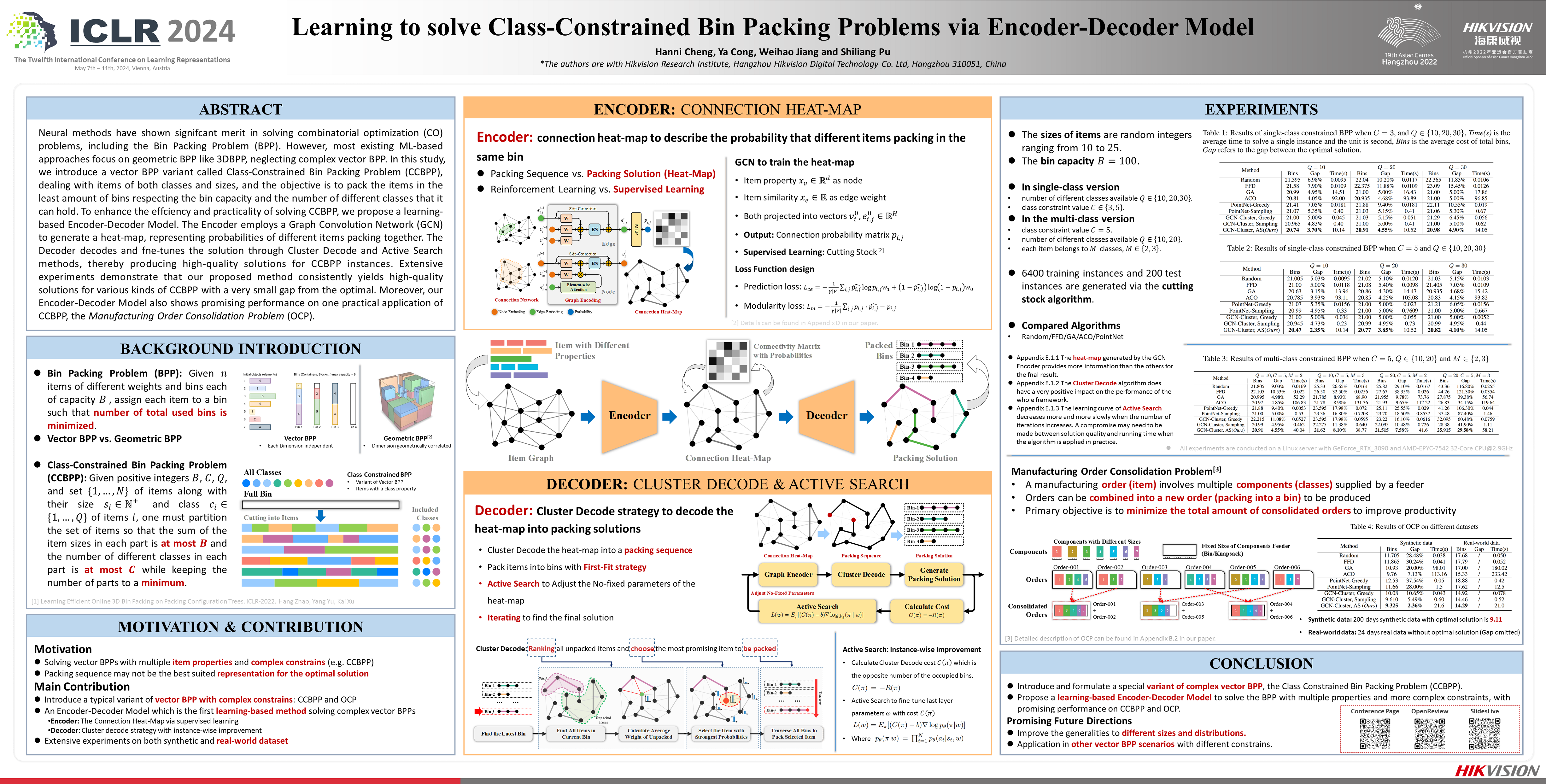 Neural methods have shown significant merit in solving combinatorial optimization (CO) problems, including the Bin Packing Problem (BPP). However, most existing ML-based approaches focus on geometric BPP like 3DBPP, neglecting complex vector BPP. In this study, we introduce a vector BPP variant called Class-Constrained Bin Packing Problem (CCBPP), dealing with items of both classes and sizes, and the objective is to pack the items in the least amount of bins respecting the bin capacity and the number of different classes that it can hold. To enhance the efficiency and practicality of solving CCBPP, we propose a learning-based Encoder-Decoder Model. The Encoder employs a Graph Convolution Network (GCN) to generate a heat-map, representing probabilities of different items packing together. The Decoder decodes and fine-tunes the solution through Cluster Decode and Active Search methods, thereby producing high-quality solutions for CCBPP instances. Extensive experiments demonstrate that our proposed method consistently yields high-quality solutions for various kinds of CCBPP with a very small gap from the optimal. Moreover, our Encoder-Decoder Model also shows promising performance on one practical application of CCBPP, the Manufacturing Order Consolidation Problem (OCP).