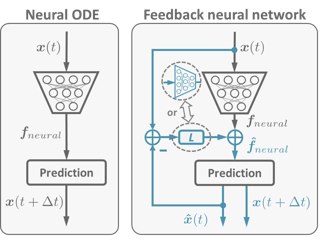 The well-known generalization problem hinders the application of artificial neural networks in continuous-time prediction tasks with varying latent dynamics. In sharp contrast, biological systems can neatly adapt to evolving environments benefiting from real-time feedback mechanisms. Inspired by the feedback philosophy, we present feedback neural networks, showing that a feedback loop can flexibly correct the learned latent dynamics of neural ordinary differential equations (neural ODEs), leading to a prominent generalization improvement. The feedback neural network is a novel two-DOF neural network, which possesses robust performance in unseen scenarios with no loss of accuracy performance on previous tasks. A linear feedback form is presented to correct the learned latent dynamics firstly, with a convergence guarantee. Then, domain randomization is utilized to learn a nonlinear neural feedback form. Finally, extensive tests including trajectory prediction of a real irregular object and model predictive control of a quadrotor with various uncertainties, are implemented, indicating significant improvements over state-of-the-art model-based and learning-based methods.