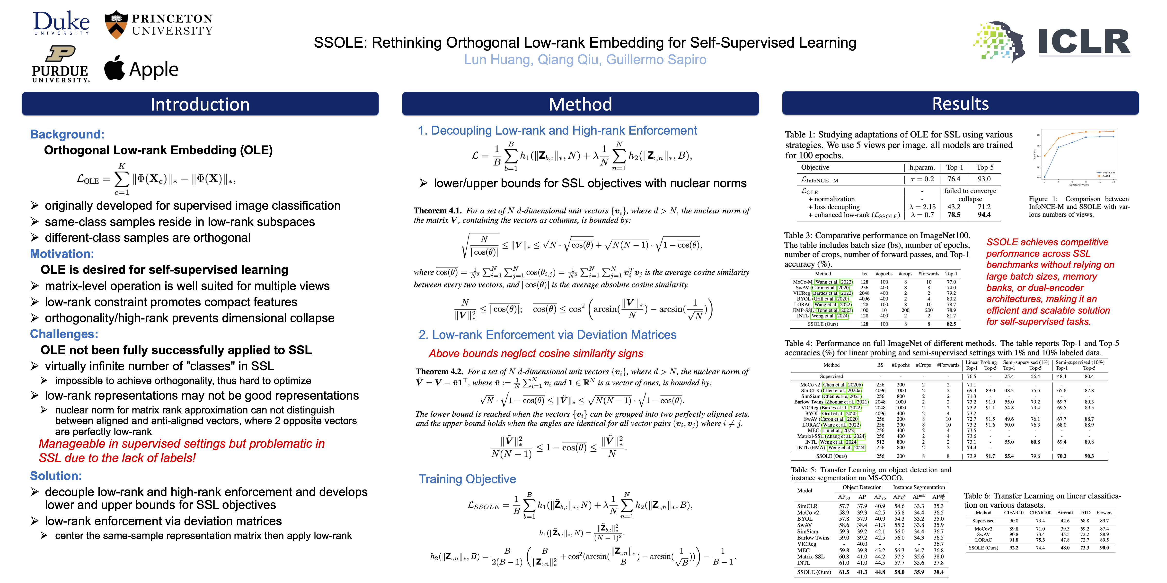 Self-supervised learning (SSL) aims to learn meaningful representations from unlabeled data. Orthogonal Low-rank Embedding (OLE) shows promise for SSL by enhancing intra-class similarity in a low-rank subspace and promoting inter-class dissimilarity in a high-rank subspace, making it particularly suitable for multi-view learning tasks. However, directly applying OLE to SSL poses significant challenges: (1) the virtually infinite number of "classes" in SSL makes achieving the OLE objective impractical, leading to representational collapse; and (2) low-rank constraints may fail to distinguish between positively and negatively correlated features, further undermining learning. To address these issues, we propose SSOLE (Self-Supervised Orthogonal Low-rank Embedding), a novel framework that integrates OLE principles into SSL by (1) decoupling the low-rank and high-rank enforcement to align with SSL objectives; and (2) applying low-rank constraints to feature deviations from their mean, ensuring better alignment of positive pairs by accounting for the signs of cosine similarities. Our theoretical analysis and empirical results demonstrate that these adaptations are crucial to SSOLE’s effectiveness. Moreover, SSOLE achieves competitive performance across SSL benchmarks without relying on large batch sizes, memory banks, or dual-encoder architectures, making it an efficient and scalable solution for self-supervised tasks. Code is available at https://github.com/husthuaan/ssole.