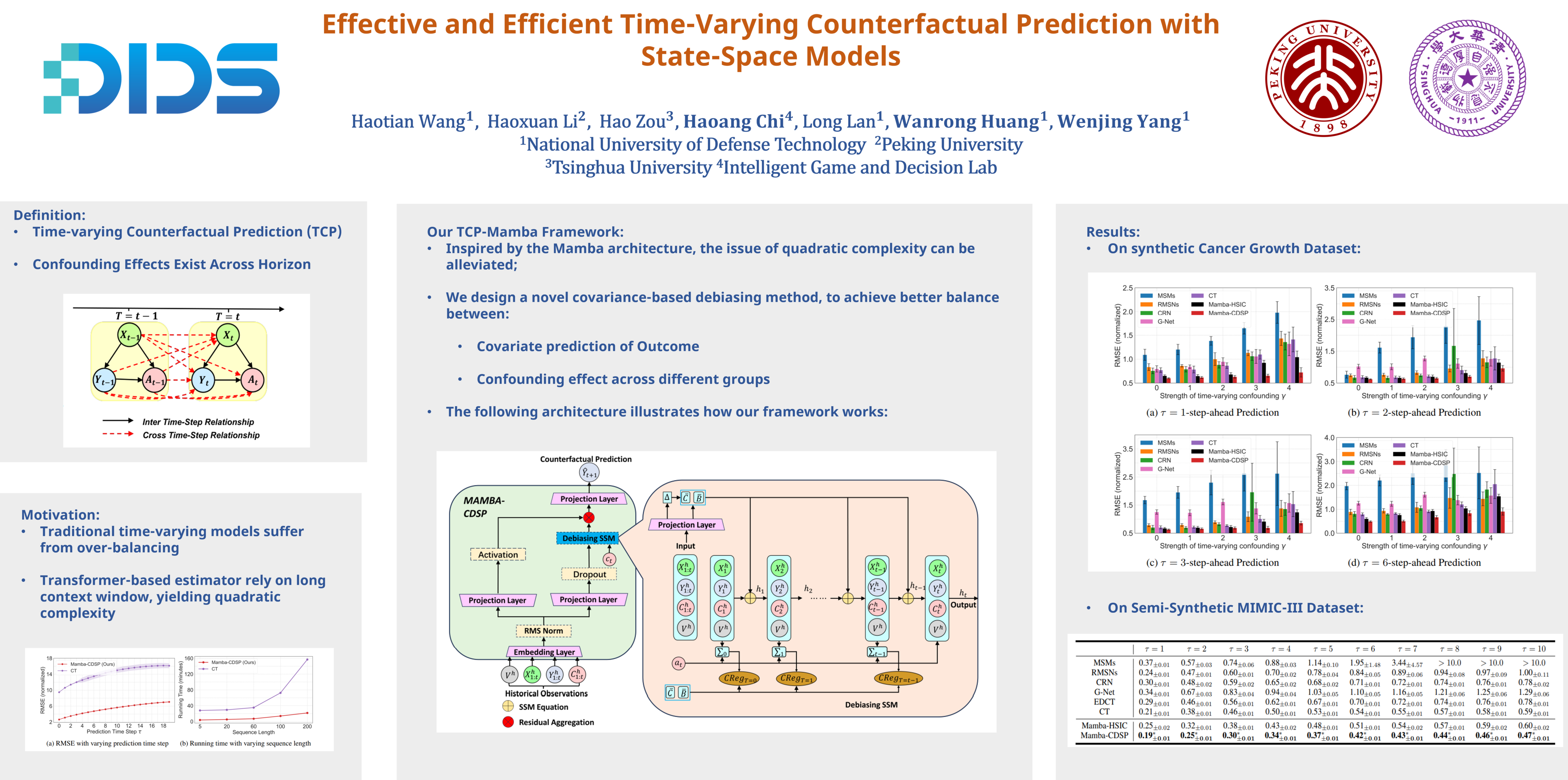 Time-varying counterfactual prediction (TCP) from observational data supports the answer of when and how to assign multiple sequential treatments, yielding importance in various applications. Despite the progress achieved by recent advances, e.g., LSTM or Transformer based causal approaches, their capability of capturing interactions in long sequences remains to be improved in both prediction performance and running efficiency. In parallel with the development of TCP, the success of the state-space models (SSMs) has achieved remarkable progress toward long-sequence modeling with saved running time. Consequently, studying how Mamba simultaneously benefits the effectiveness and efficiency of TCP becomes a compelling research direction. In this paper, we propose to exploit advantages of the SSMs to tackle the TCP task, by introducing a counterfactual Mamba model with Covariate-based Decorrelation towards Selective Parameters (Mamba-CDSP). Motivated by the over-balancing problem in TCP of the direct covariate balancing methods, we propose to de-correlate between the current treatment and the representation of historical covariates, treatments, and outcomes, which can mitigate the confounding bias while preserve more covariate information. In addition, we show that the overall de-correlation in TCP is equivalent to regularizing the selective parameters of Mamba over each time step, which leads our approach to be effective and lightweight. We conducted extensive experiments on both synthetic and real-world datasets, demonstrating that Mamba-CDSP not only outperforms baselines by a large margin, but also exhibits prominent running efficiency.