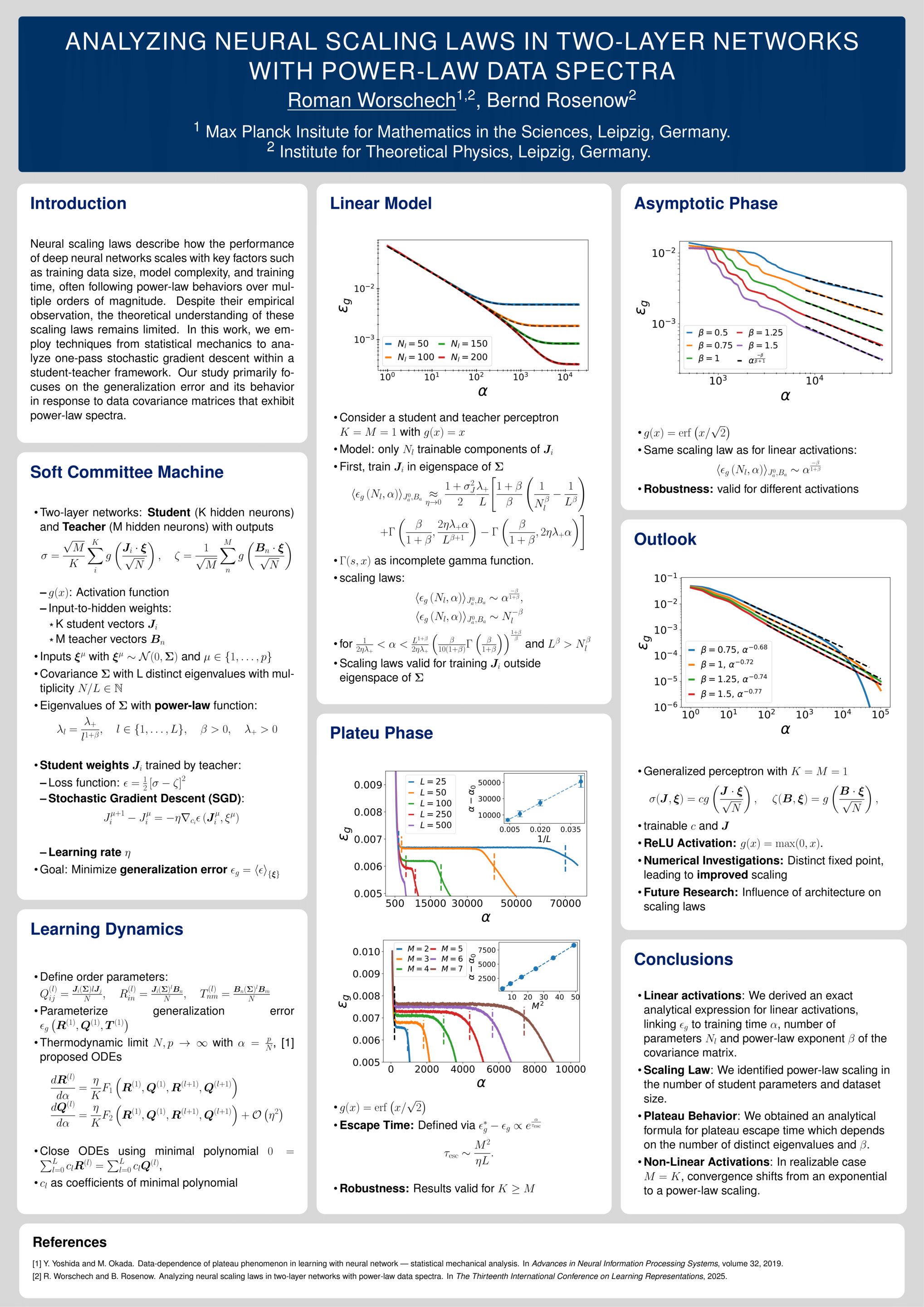 Neural scaling laws describe how the performance of deep neural networks scales with key factors such as training data size, model complexity, and training time, often following power-law behaviors over multiple orders of magnitude. Despite their empirical observation, the theoretical understanding of these scaling laws remains limited. In this work, we employ techniques from statistical mechanics to analyze one-pass stochastic gradient descent within a student-teacher framework, where both the student and teacher are two-layer neural networks. Our study primarily focuses on the generalization error and its behavior in response to data covariance matrices that exhibit power-law spectra.For linear activation functions, we derive analytical expressions for the generalization error, exploring different learning regimes and identifying conditions under which power-law scaling emerges. Additionally, we extend our analysis to non-linear activation functions in the feature learning regime, investigating how power-law spectra in the data covariance matrix impact learning dynamics. Importantly, we find that the length of the symmetric plateau depends on the number of distinct eigenvalues of the data covariance matrix and the number of hidden units, demonstrating how these plateaus behave under various configurations. In addition, our results reveal a transition from exponential to power-law convergence in the specialized phase when the data covariance matrix possesses a power-law spectrum. This work contributes to the theoretical understanding of neural scaling laws and provides insights into optimizing learning performance in practical scenarios involving complex data structures.