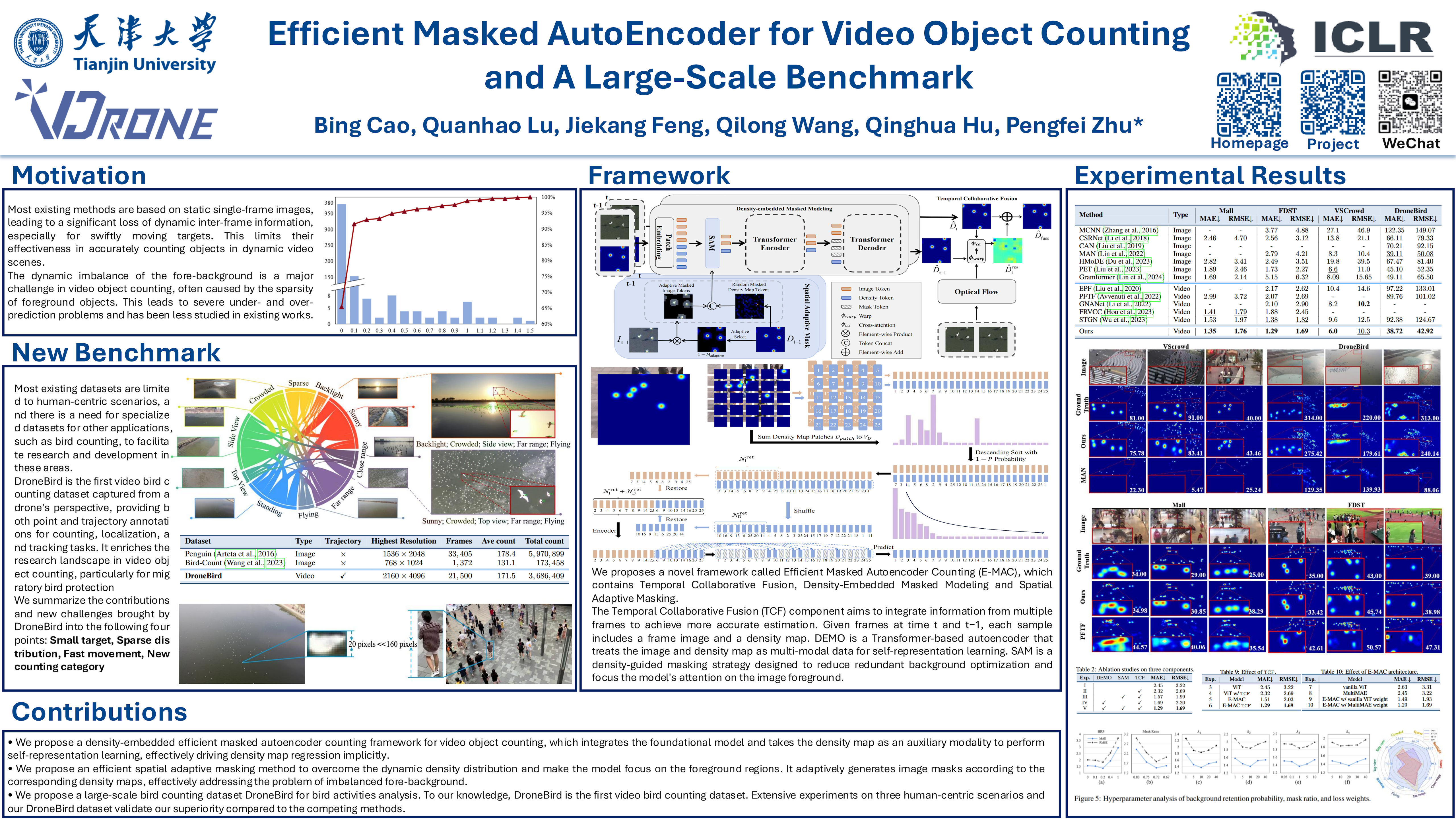 The dynamic imbalance of the fore-background is a major challenge in video object counting, which is usually caused by the sparsity of target objects. This remains understudied in existing works and often leads to severe under-/over-prediction errors. To tackle this issue in video object counting, we propose a density-embedded Efficient Masked Autoencoder Counting (E-MAC) framework in this paper. To empower the model’s representation ability on density regression, we develop a new Density-Embedded Masked mOdeling (DEMO) method, which first takes the density map as an auxiliary modality to perform multimodal self-representation learning for image and density map. Although DEMO contributes to effective cross-modal regression guidance, it also brings in redundant background information, making it difficult to focus on the foreground regions. To handle this dilemma, we propose an efficient spatial adaptive masking derived from density maps to boost efficiency. Meanwhile, we employ an optical flow-based temporal collaborative fusion strategy to effectively capture the dynamic variations across frames, aligning features to derive multi-frame density residuals. The countingaccuracy of the current frame is boosted by harnessing the information from adjacent frames. In addition, considering that most existing datasets are limited to human-centric scenarios, we propose a large video bird counting dataset, DroneBird, in natural scenarios for migratory bird protection. Extensive experiments on three crowd datasets and our DroneBird validate our superiority againstthe counterparts. The code and dataset are available.