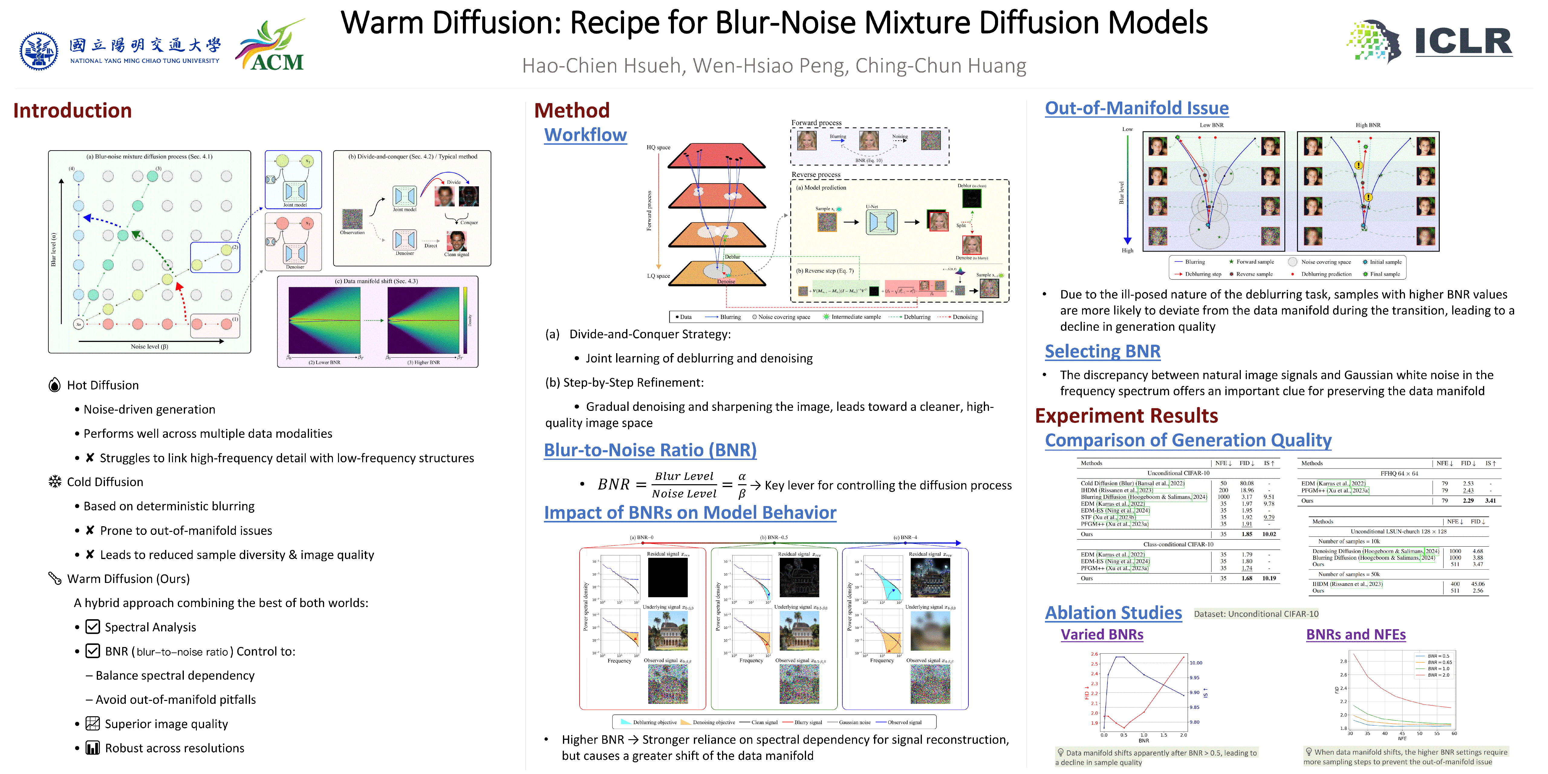 Diffusion probabilistic models have achieved remarkable success in generative tasks across diverse data types. While recent studies have explored alternative degradation processes beyond Gaussian noise, this paper bridges two key diffusion paradigms: hot diffusion, which relies entirely on noise, and cold diffusion, which uses only blurring without noise. We argue that hot diffusion fails to exploit the strong correlation between high-frequency image detail and low-frequency structures, leading to random behaviors in the early steps of generation. Conversely, while cold diffusion leverages image correlations for prediction, it neglects the role of noise (randomness) in shaping the data manifold, resulting in out-of-manifold issues and partially explaining its performance drop. To integrate both strengths, we propose Warm Diffusion, a unified Blur-Noise Mixture Diffusion Model (BNMD), to control blurring and noise jointly. Our divide-and-conquer strategy exploits the spectral dependency in images, simplifying score model estimation by disentangling the denoising and deblurring processes. We further analyze the Blur-to-Noise Ratio (BNR) using spectral analysis to investigate the trade-off between model learning dynamics and changes in the data manifold. Extensive experiments across benchmarks validate the effectiveness of our approach for image generation.