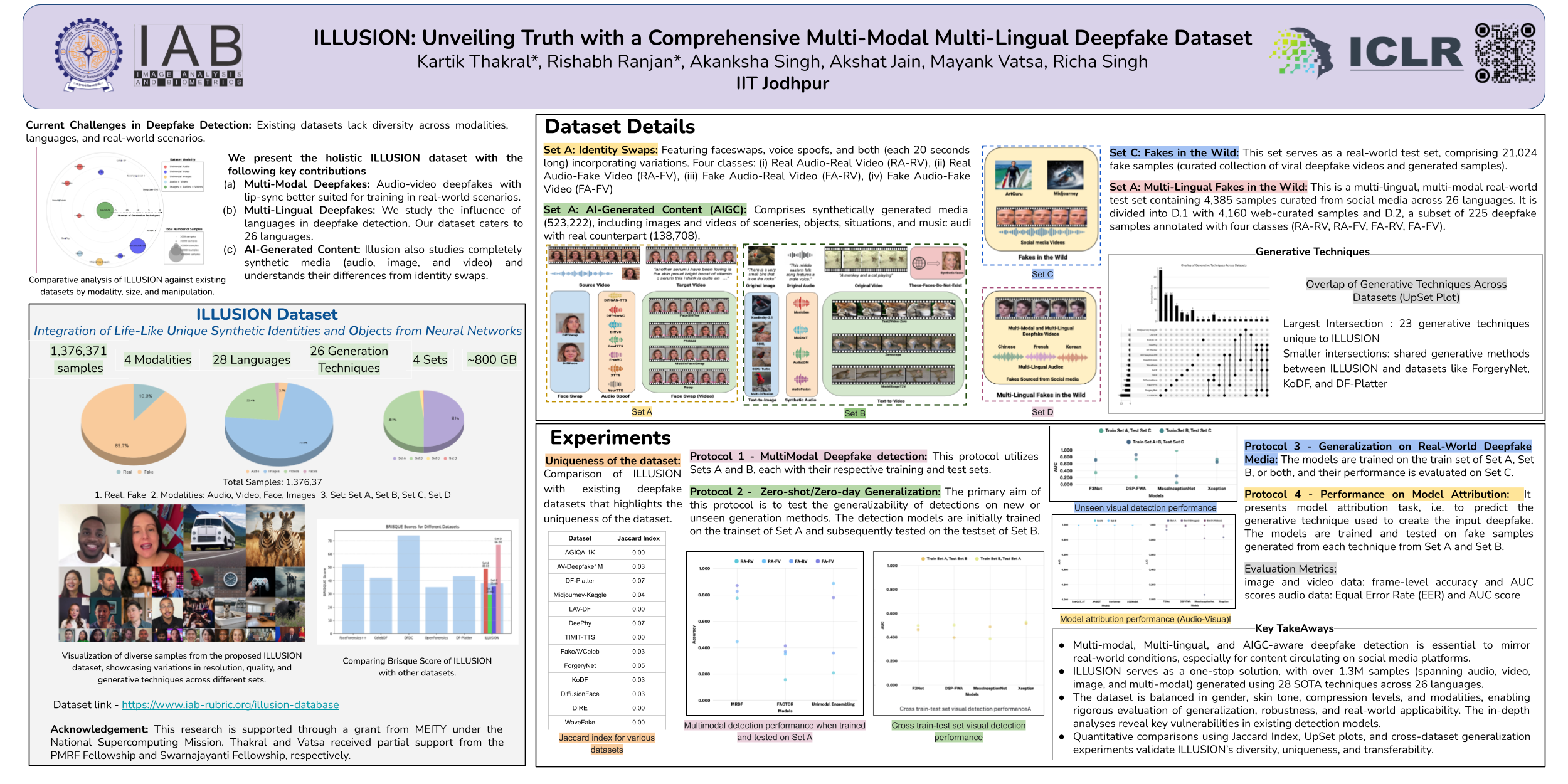 The proliferation of deepfakes and AI-generated content has led to a surge in media forgeries and misinformation, necessitating robust detection systems. However, current datasets lack diversity across modalities, languages, and real-world scenarios. To address this gap, we present ILLUSION (Integration of Life-Like Unique Synthetic Identities and Objects from Neural Networks), a large-scale, multi-modaldeepfake dataset comprising 1.3 million samples spanning audio-visual forgeries, 26 languages, challenging noisy environments, and various manipulation protocols. Generated using 28 state-of-the-art generative techniques, ILLUSION includesfaceswaps, audio spoofing, synchronized audio-video manipulations, and synthetic media while ensuring a balanced representation of gender and skin tone for unbiased evaluation. Using Jaccard Index and UpSet plot analysis, we demonstrate ILLUSION’s distinctiveness and minimal overlap with existing datasets, emphasizing its novel generative coverage. We benchmarked image, audio, video, and multi-modal detection models, revealing key challenges such as performance degradation in multilingual and multi-modal contexts, vulnerability to real-world distortions, and limited generalization to zero-day attacks. By bridging synthetic and real-world complexities, ILLUSION provides a challenging yet essential platform for advancing deepfake detection research. The dataset is publicly available at https://www.iab-rubric.org/illusion-database.
