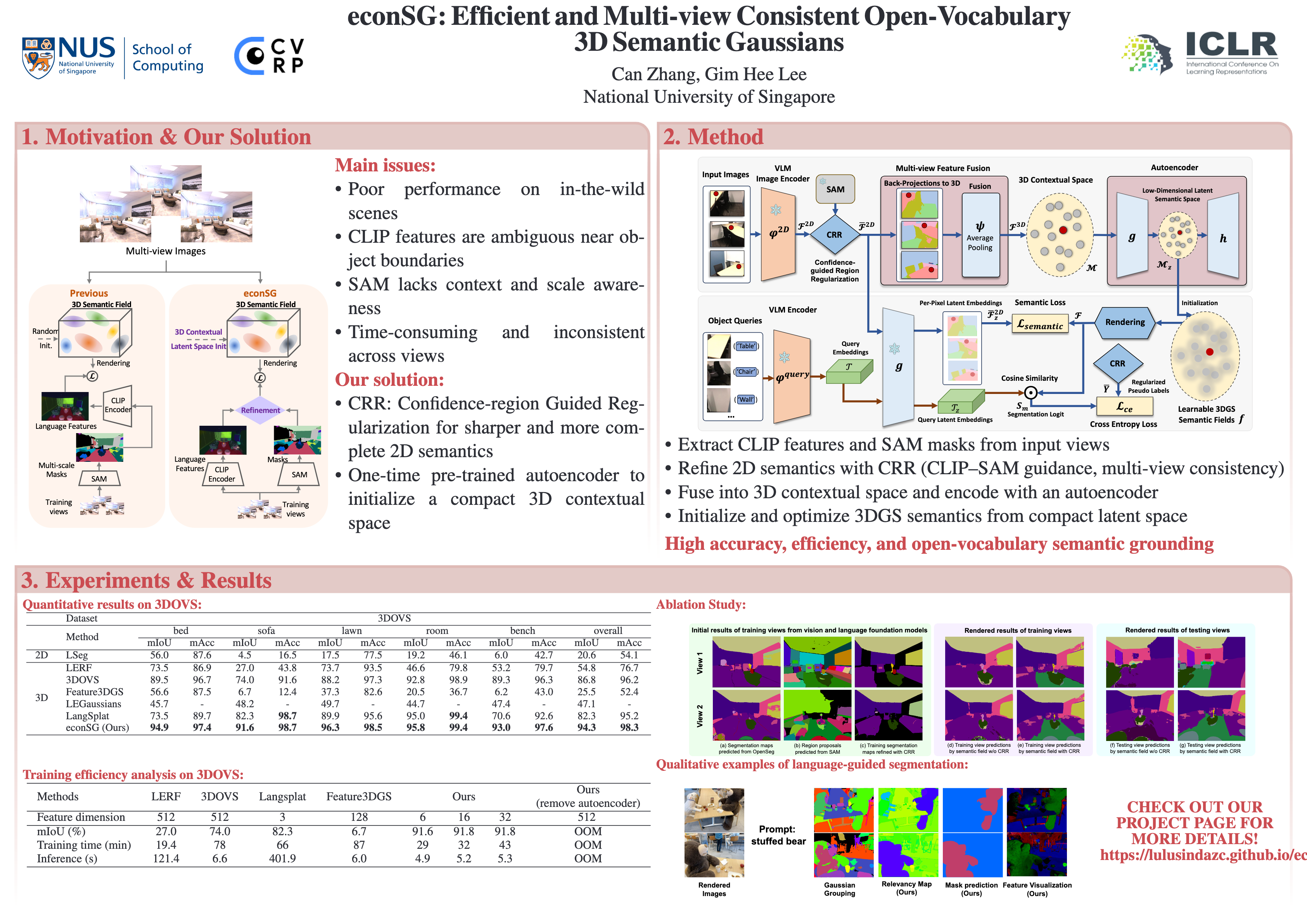 The primary focus of most recent works on open-vocabulary neural fields is extracting precise semantic featuresfrom the VLMs and then consolidating them efficiently into a multi-view consistent 3D neural fieldsrepresentation. However, most existing works over-trusted SAM to regularize image-level CLIP without any further refinement. Moreover, several existing works improved efficiency by dimensionality reduction of semantic features from 2D VLMs before fusing with 3DGS semantic fields, which inevitably leads to multi-view inconsistency. In this work, we propose econSG for open-vocabulary semantic segmentation with 3DGS. Our econSG consists of: 1) A Confidence-region Guided Regularization (CRR) that mutually refines SAM and CLIP to get the best of both worlds for precise semantic features with complete and precise boundaries. 2) A low dimensional contextual space to enforce 3D multi-view consistency while improving computational efficiency by fusing backprojected multi-view 2D features and follow by dimensional reduction directly on the fused 3D features instead of operating on each 2D view separately. Our econSG show state-of-the-art performance on four benchmark datasets compared to the existing methods. Furthermore, we are also the most efficient training among all the methods.