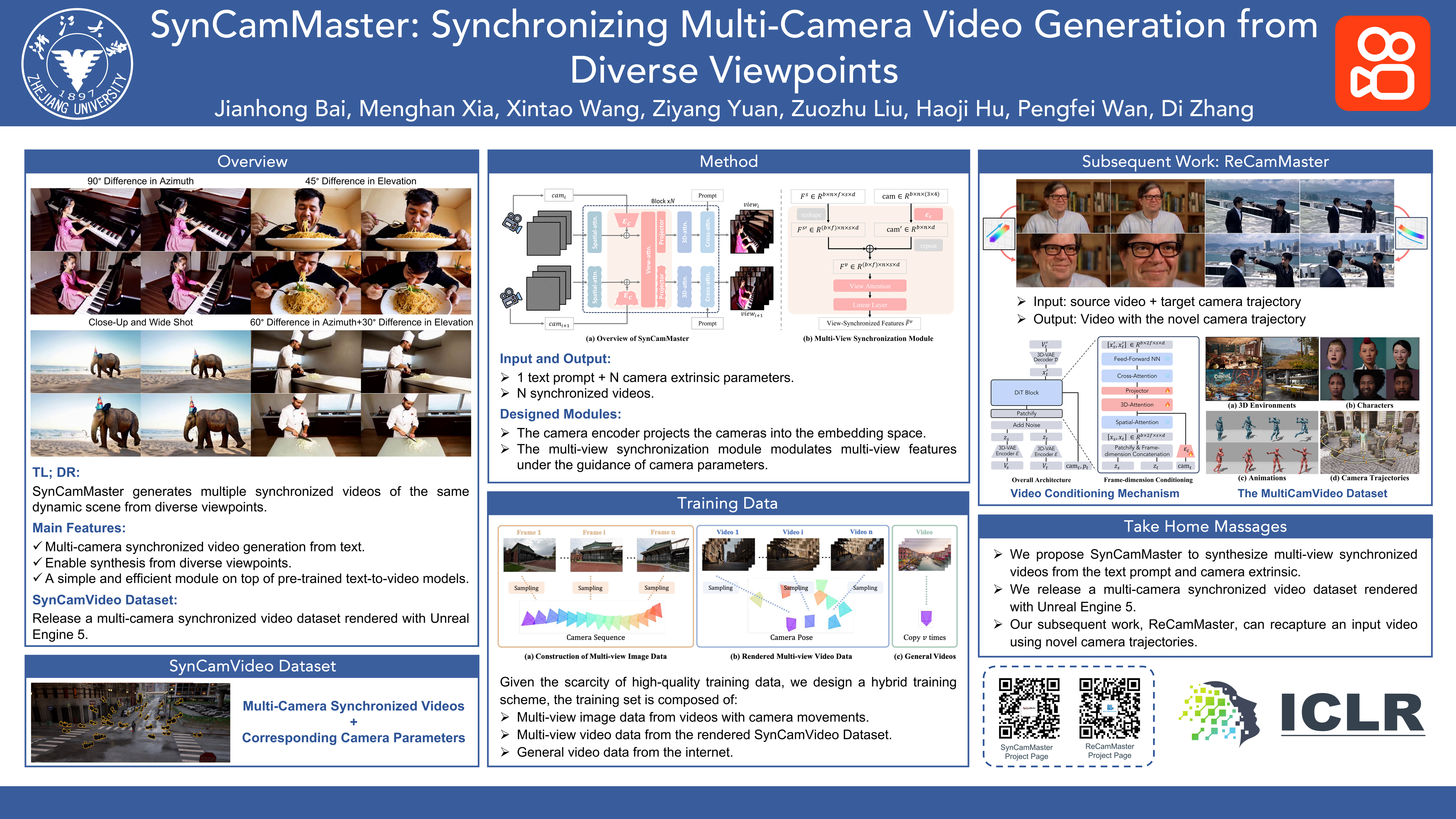 Recent advancements in video diffusion models demonstrate remarkable capabilities in simulating real-world dynamics and 3D consistency. This progress motivates us to explore the potential of these models to maintain dynamic consistency across diverse viewpoints, a feature highly sought after in applications like virtual filming. Unlike existing methods focused on multi-view generation of single objects for 4D reconstruction, our interest lies in generating open-world videos from arbitrary viewpoints, incorporating six degrees of freedom (6 DoF) camera poses.To achieve this, we propose a plug-and-play module that enhances a pre-trained text-to-video model for multi-camera video generation, ensuring consistent content across different viewpoints. Specifically, we introduce a multi-view synchronization module designed to maintain appearance and geometry consistency across these viewpoints. Given the scarcity of high-quality training data, we also propose a progressive training scheme that leverages multi-camera images and monocular videos as a supplement to Unreal Engine-rendered multi-camera videos. This comprehensive approach significantly benefits our model.Experimental results demonstrate the superiority of our proposed method over existing competitors and several baselines. Furthermore, our method enables intriguing extensions, such as re-rendering a video from multiple novel viewpoints. Project webpage: https://jianhongbai.github.io/SynCamMaster/