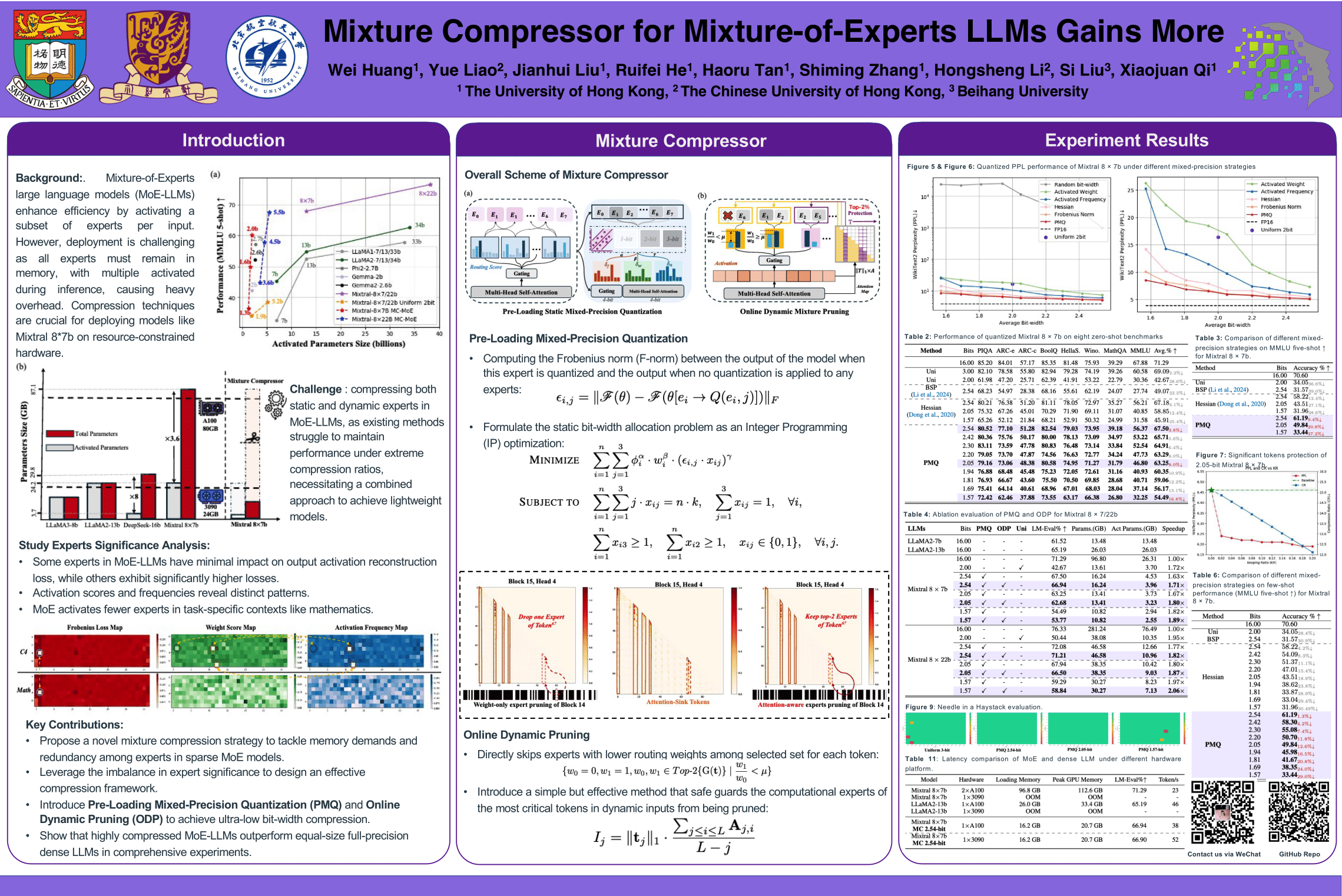 Mixture-of-Experts large language models (MoE-LLMs) marks a significant step forward of language models, however, they encounter two critical challenges in practice: 1) expert parameters lead to considerable memory consumption and loading latency; and 2) the current activated experts are redundant, as many tokens may only require a single expert. Motivated by these issues, we investigate the MoE-LLMs and make two key observations: a) different experts exhibit varying behaviors on activation reconstruction error, routing scores, and activated frequencies, highlighting their differing importance, and b) not all tokens are equally important-- only a small subset is critical. Building on these insights, we propose MC, a training-free Mixture-Compressor for MoE-LLMs, which leverages the significance of both experts and tokens to achieve an extreme compression. First, to mitigate storage and loading overheads, we introduce Pre-Loading Mixed-Precision Quantization (PMQ), which formulates the adaptive bit-width allocation as a Linear Programming (LP) problem, where the objective function balances multi-factors reflecting the importance of each expert. Additionally, we develop Online Dynamic Pruning (ODP), which identifies important tokens to retain and dynamically select activated experts for other tokens during inference to optimize efficiency while maintaining performance. Our MC integrates static quantization and dynamic pruning to collaboratively achieve extreme compression for MoE-LLMs with less accuracy loss, ensuring an optimal trade-off between performance and efficiency Extensive experiments confirm the effectiveness of our approach. For instance, at 2.54 bits, MC compresses 76.6% of the model, with only a 3.8% average accuracy loss. During dynamic inference, we further reduce activated parameters by 15%, with a performance drop of less than 0.6%. Remarkably, MC even surpasses floating-point 13b dense LLMs with significantly smaller parameter sizes, suggesting that mixture compression in MoE-LLMs has the potential to outperform both comparable and larger dense LLMs. Our code isavailable at https://github.com/Aaronhuang-778/MC-MoE
