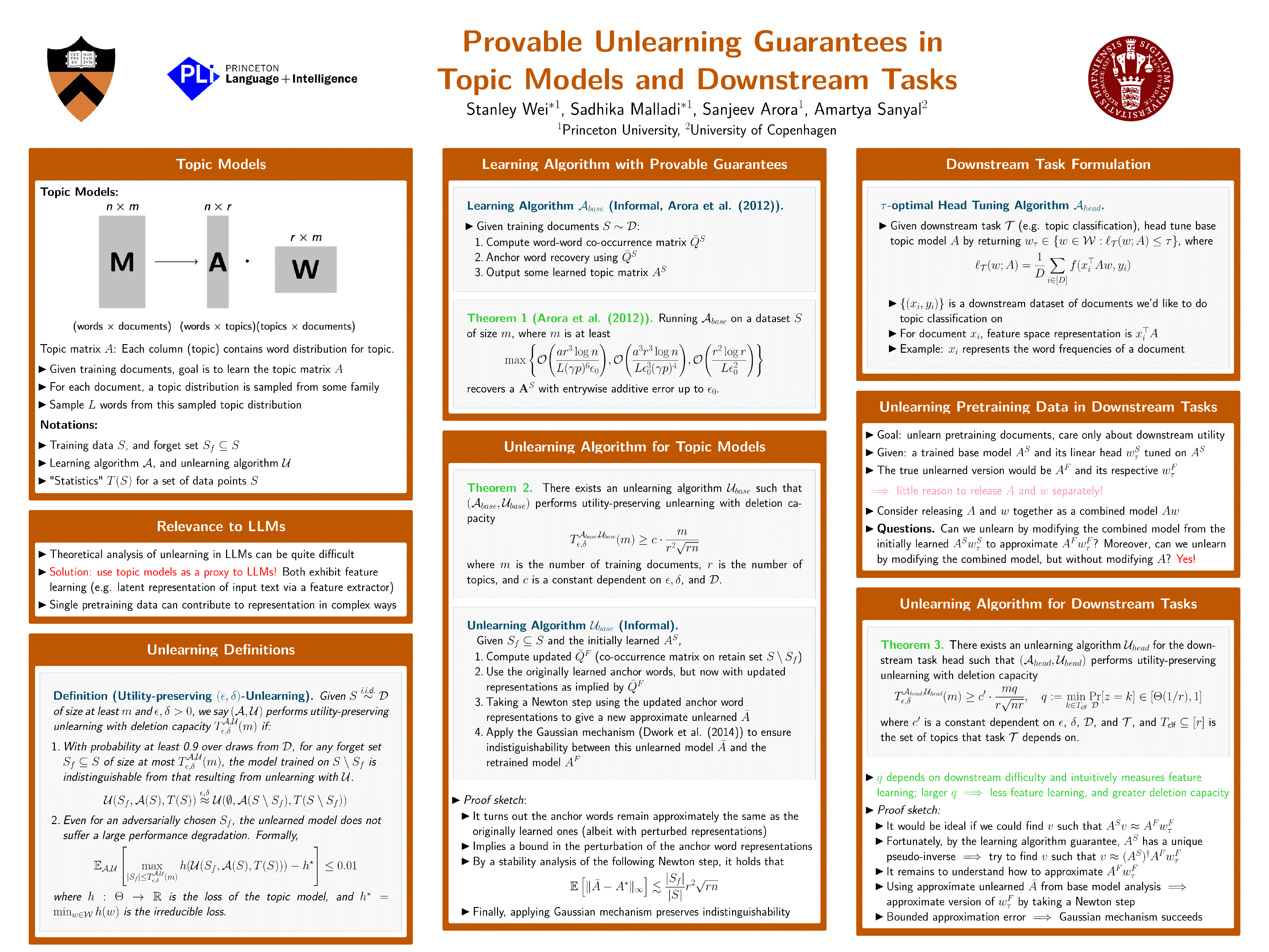 Provable unlearning in topic modeling and downstream tasks