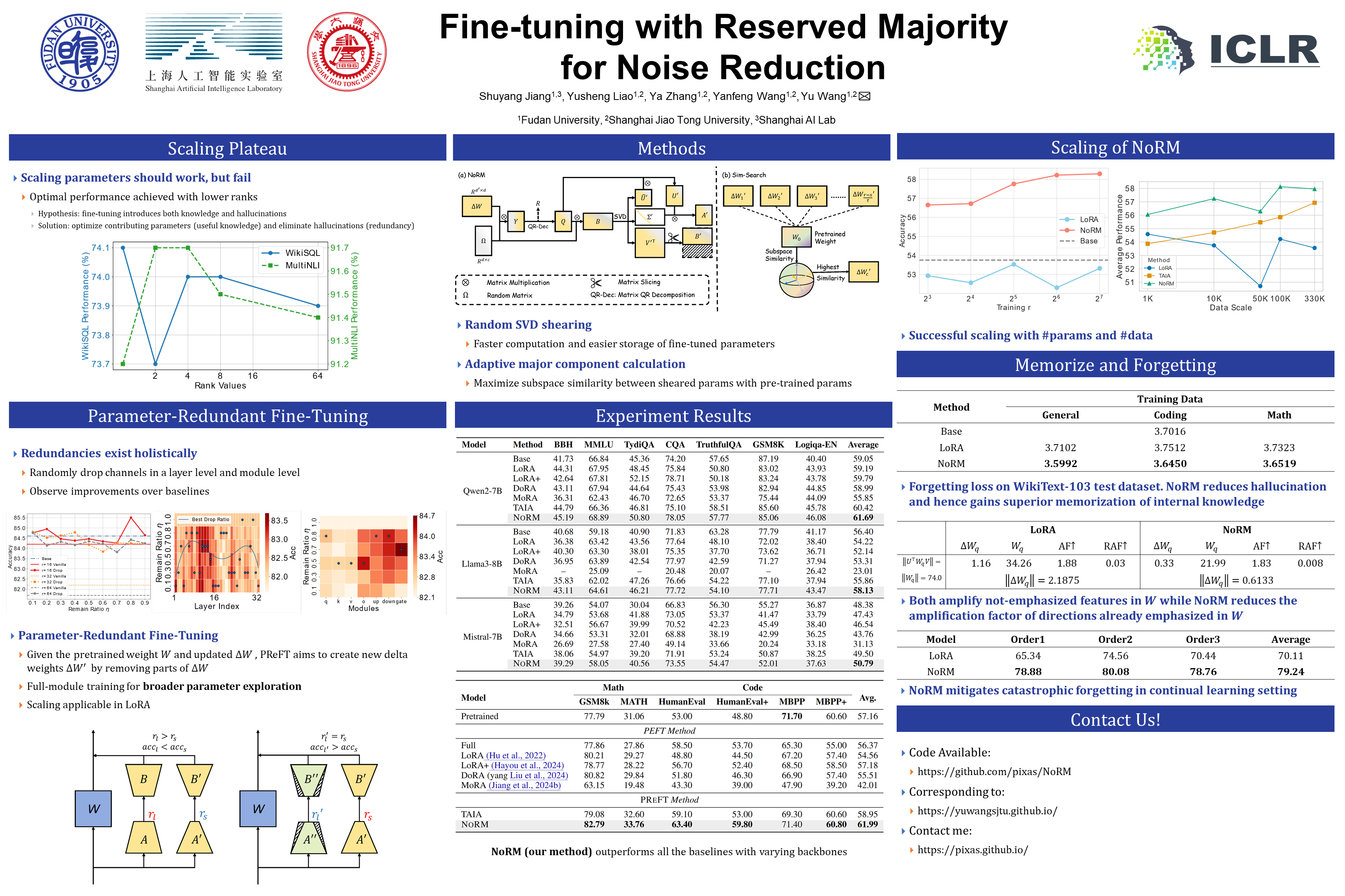 Parameter-efficient fine-tuning (PEFT) has revolutionized supervised fine-tuning, where LoRA and its variants gain the most popularity due to their low training costs and zero inference latency.However, LoRA tuning not only injects knowledgeable features but also noisy hallucination during fine-tuning, which hinders the utilization of tunable parameters with the increasing LoRA rank.In this work, we first investigate in-depth the redundancies among LoRA parameters with substantial empirical studies.Aiming to resemble the learning capacity of high ranks from the findings, we set up a new fine-tuning framework, \textbf{P}arameter-\textbf{Re}dundant \textbf{F}ine-\textbf{T}uning (\preft), which follows the vanilla LoRA tuning process but is required to reduce redundancies before merging LoRA parameters back to pre-trained models.Based on this framework, we propose \textbf{No}ise reduction with \textbf{R}eserved \textbf{M}ajority~(\norm), which decomposes the LoRA parameters into majority parts and redundant parts with random singular value decomposition.The major components are determined by the proposed \search method, specifically employing subspace similarity to confirm the parameter groups that share the highest similarity with the base weight.By employing \norm, we enhance both the learning capacity and benefits from larger ranks, which consistently outperforms both LoRA and other \preft-based methods on various downstream tasks, such as general instruction tuning, math reasoning and code generation. Code is available at \url{https://github.com/pixas/NoRM}.