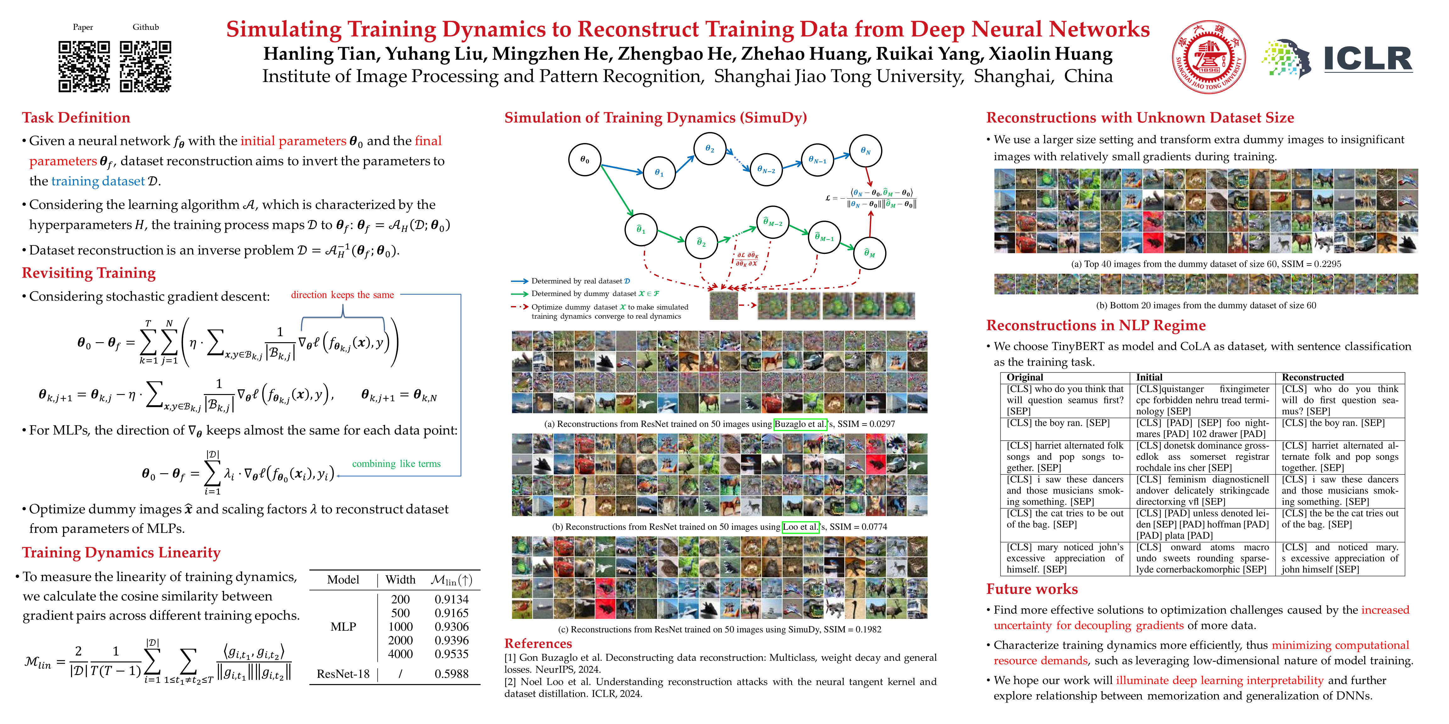Whether deep neural networks (DNNs) memorize the training data is a fundamental open question in understanding deep learning. A direct way to verify the memorization of DNNs is to reconstruct training data from DNNs’ parameters. Since parameters are gradually determined by data throughout training, characterizing training dynamics is important for reconstruction. Pioneering works rely on the linear training dynamics of shallow NNs with large widths, but cannot be extended to more practical DNNs which have non-linear dynamics. We propose Simulation of training Dynamics (SimuDy) to reconstruct training data from DNNs. Specifically, we simulate the training dynamics by training the model from the initial parameters with a dummy dataset, then optimize this dummy dataset so that the simulated dynamics reach the same final parameters as the true dynamics. By incorporating dummy parameters in the simulated dynamics, SimuDy effectively describes non-linear training dynamics. Experiments demonstrate that SimuDy significantly outperforms previous approaches when handling non-linear training dynamics, and for the first time, most training samples can be reconstructed from a trained ResNet’s parameters.