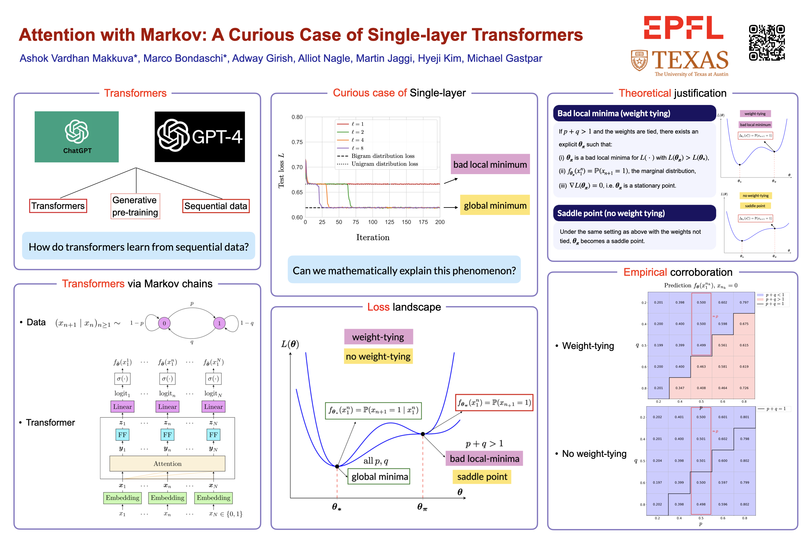 Attention-based transformers have achieved tremendous success across a variety of disciplines including natural languages. To deepen our understanding of their sequential modeling capabilities, there is a growing interest in using Markov input processes to study them. A key finding is that when trained on first-order Markov chains, transformers with two or more layers consistently develop an induction head mechanism to estimate the in-context bigram conditional distribution. In contrast, single-layer transformers, unable to form an induction head, directly learn the Markov kernel but often face a surprising challenge: they become trapped in local minima representing the unigram distribution, whereas deeper models reliably converge to the ground-truth bigram. While single-layer transformers can theoretically model first-order Markov chains, their empirical failure to learn this simple kernel in practice remains a curious phenomenon. To explain this contrasting behavior of single-layer models, in this paper we introduce a new framework for a principled analysis of transformers via Markov chains. Leveraging our framework, we theoretically characterize the loss landscape of single-layer transformers and show the existence of global minima (bigram) and bad local minima (unigram) contingent on data properties and model architecture. We precisely delineate the regimes under which these local optima occur. Backed by experiments, we demonstrate that our theoretical findings are in congruence with the empirical results. Finally, we outline several open problems in this arena.