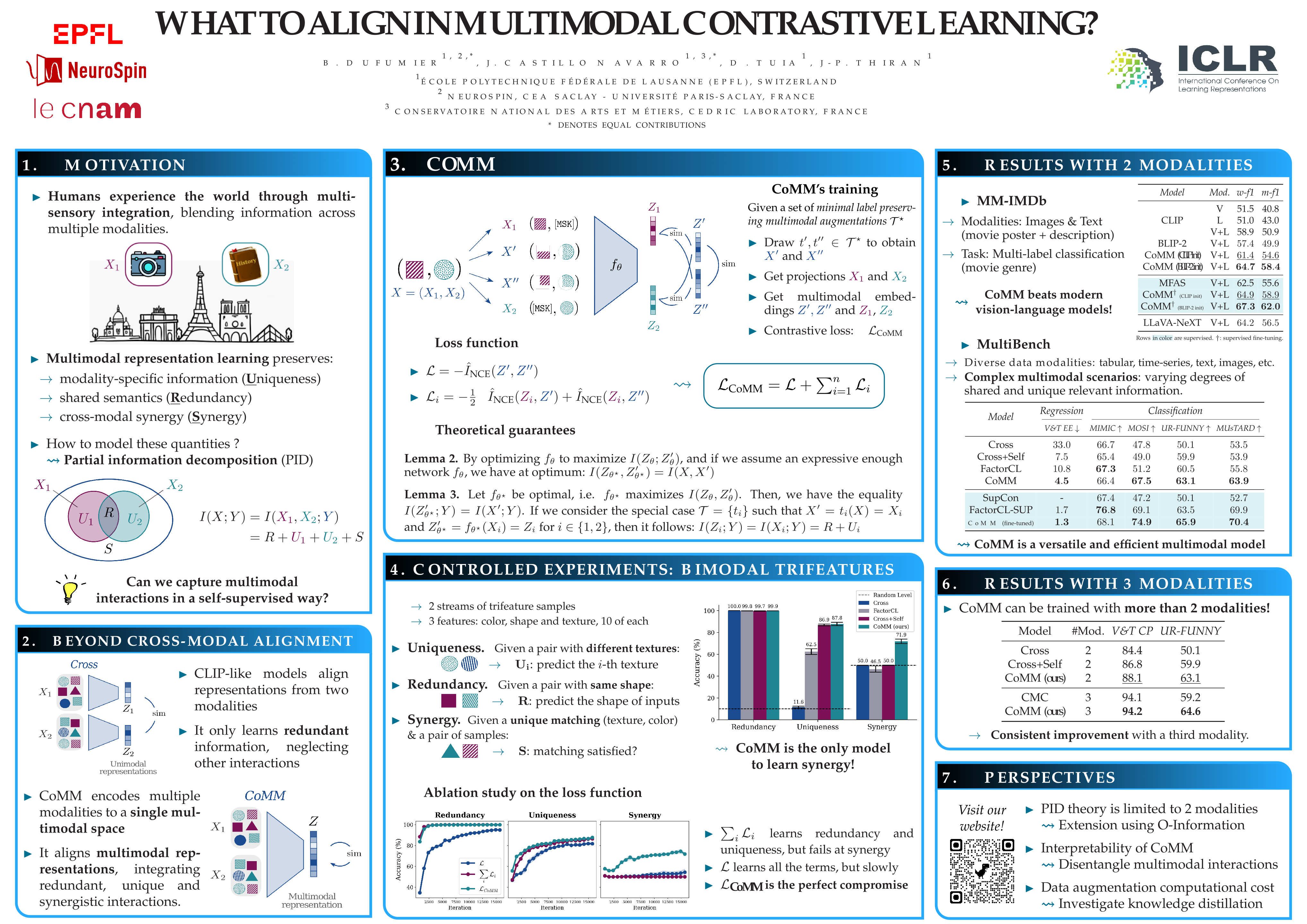 Humans perceive the world through multisensory integration, blending the information of different modalities to adapt their behavior.Contrastive learning offers an appealing solution for multimodal self-supervised learning. Indeed, by considering each modality as a different view of the same entity, it learns to align features of different modalities in a shared representation space. However, this approach is intrinsically limited as it only learns shared or redundant information between modalities, while multimodal interactions can arise in other ways. In this work, we introduce CoMM, a Contrastive Multimodal learning strategy that enables the communication between modalities in a single multimodal space. Instead of imposing cross- or intra- modality constraints, we propose to align multimodal representations by maximizing the mutual information between augmented versions of these multimodal features. Our theoretical analysis shows that shared, synergistic and unique terms of information naturally emerge from this formulation, allowing us to estimate multimodal interactions beyond redundancy. We test CoMM both in a controlled and in a series of real-world settings: in the former, we demonstrate that CoMM effectively captures redundant, unique and synergistic information between modalities. In the latter, CoMM learns complex multimodal interactions and achieves state-of-the-art results on seven multimodal tasks.