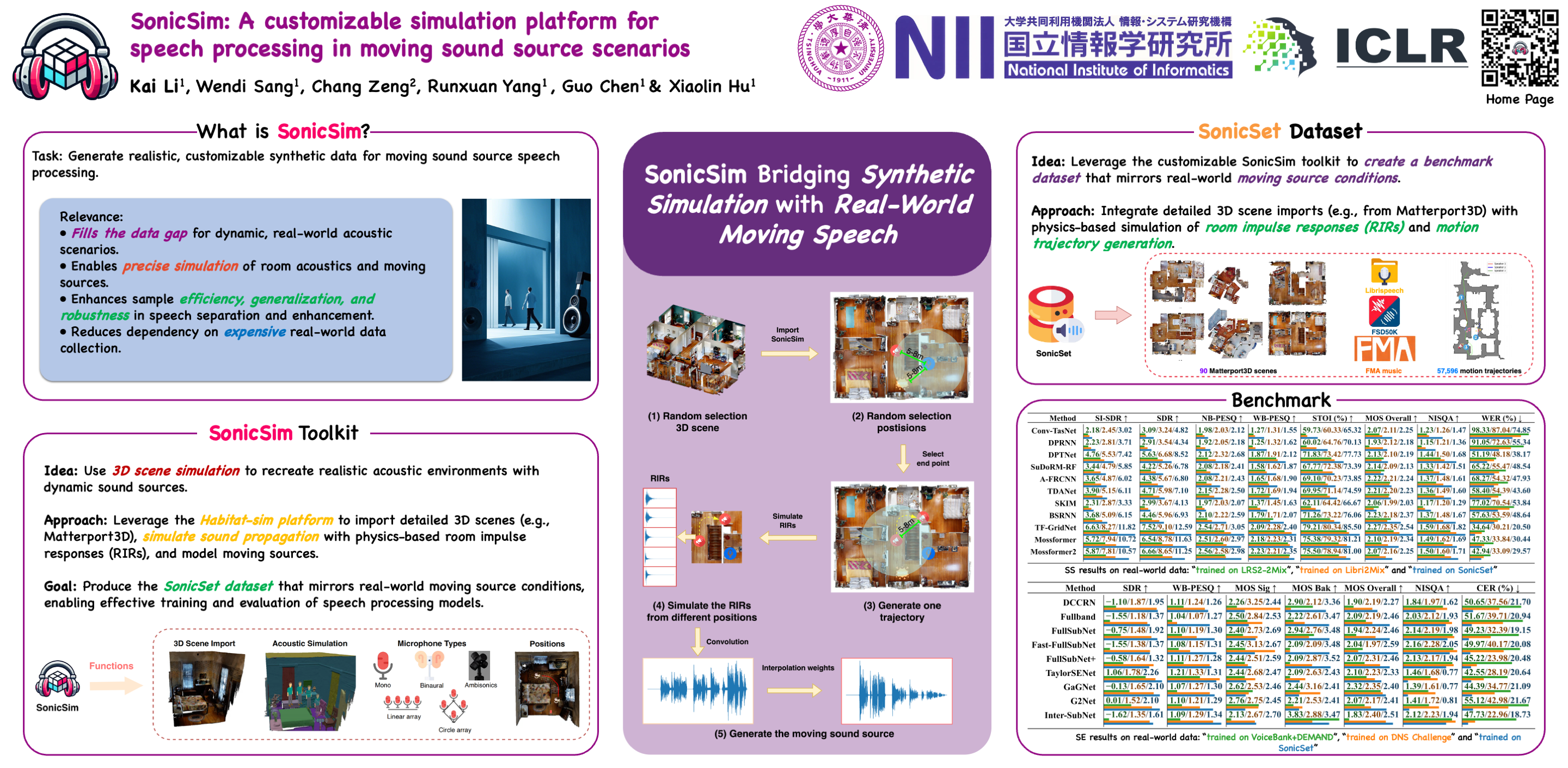 Systematic evaluation of speech separation and enhancement models under moving sound source conditions requires extensive and diverse data. However, real-world datasets often lack sufficient data for training and evaluation, and synthetic datasets, while larger, lack acoustic realism. Consequently, neither effectively meets practical needs. To address this issue, we introduce SonicSim, a synthetic toolkit based on the embodied AI simulation platform Habitat-sim, designed to generate highly customizable data for moving sound sources. SonicSim supports multi-level adjustments—including scene-level, microphone-level, and source-level—enabling the creation of more diverse synthetic data. Leveraging SonicSim, we constructed a benchmark dataset called SonicSet, utilizing LibriSpeech, Freesound Dataset 50k (FSD50K), Free Music Archive (FMA), and 90 scenes from Matterport3D to evaluate speech separation and enhancement models. Additionally, to investigate the differences between synthetic and real-world data, we selected 5 hours of raw, non-reverberant data from the SonicSet validation set and recorded a real-world speech separation dataset, providing a reference for comparing SonicSet with other synthetic datasets. For speech enhancement, we utilized the real-world dataset RealMAN to validate the acoustic gap between SonicSet and existing synthetic datasets. The results indicate that models trained on SonicSet generalize better to real-world scenarios compared to other synthetic datasets. Code is publicly available at https://cslikai.cn/SonicSim/.