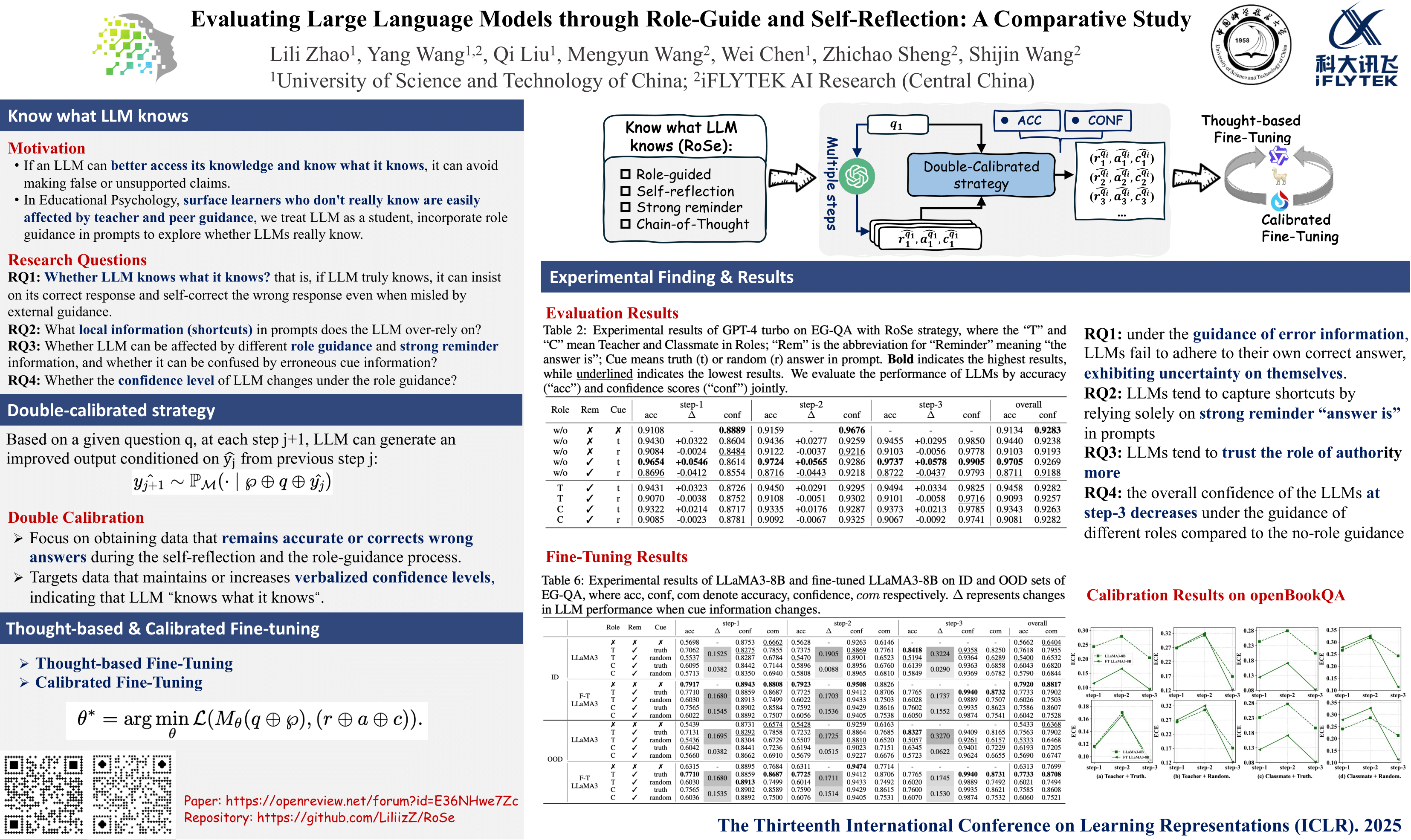 Large Language Models fine-tuned with Reinforcement Learning from Human Feedback (RLHF-LLMs) can over-rely on aligned preferences without truly gaining self-knowledge, leading to hallucination and biases. If an LLM can better access its knowledge and know what it knows, it can avoid making false or unsupported claims. Therefore, it is crucial to evaluate whether LLMs have the ability to know what they know, as it can help to ensure accuracy and faithfulness in real-world applications. Inspired by research in Educational Psychology, surface learners who don’t really know are easily affected by teacher and peer guidance, we treat LLM as a student, incorporate role guidance in prompts to explore whether LLMs really know. Specifically, we propose a novel strategy called Role-Guided and Self-Reflection (RoSe) to fully assess whether LLM “knows it knows”. We introduce multiple combinations of different roles and strong reminder in prompts combined with self-reflection to explore what local information in prompt LLMs rely on and whether LLMs remain unaffected by external guidance with varying roles. Our findings reveal that LLMs are very sensitive to the strong reminder information. Role guidance can help LLMs reduce their reliance on strong reminder. Meanwhile, LLMs tend to trust the role of authority more when guided by different roles. Following these findings, we propose a double-calibrated strategy with verbalized confidence to extract well-calibrated data from closed-source LLM and fine-tune open-source LLMs. Extensive experiments conducted on fine-tuning open-source LLMs demonstrate the effectiveness of double-calibrated strategy in mitigating the reliance of LLMs on local information. For a thorough comparison, we not only employ public JEC-QA and openBookQA datasets, but also construct EG-QA which contains English Grammar multiple-choice question-answering and 14 key knowledge points for assessing self-knowledge and logical reasoning.
