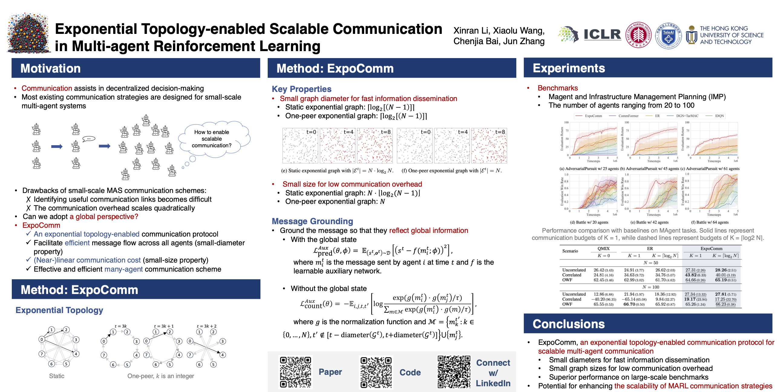 In cooperative multi-agent reinforcement learning (MARL), well-designed communication protocols can effectively facilitate consensus among agents, thereby enhancing task performance. Moreover, in large-scale multi-agent systems commonly found in real-world applications, effective communication plays an even more critical role due to the escalated challenge of partial observability compared to smaller-scale setups. In this work, we endeavor to develop a scalable communication protocol for MARL. Unlike previous methods that focus on selecting optimal pairwise communication links—a task that becomes increasingly complex as the number of agents grows—we adopt a global perspective on communication topology design. Specifically, we propose utilizing the exponential topology to enable rapid information dissemination among agents by leveraging its small-diameter and small-size properties. This approach leads to a scalable communication protocol, named ExpoComm. To fully unlock the potential of exponential graphs as communication topologies, we employ memory-based message processors and auxiliary tasks to ground messages, ensuring that they reflect global information and benefit decision-making. Extensive experiments on large-scale cooperative benchmarks, including MAgent and Infrastructure Management Planning, demonstrate the superior performance and robust zero-shot transferability of ExpoComm compared to existing communication strategies. Thecode is publicly available at https://github.com/LXXXXR/ExpoComm.