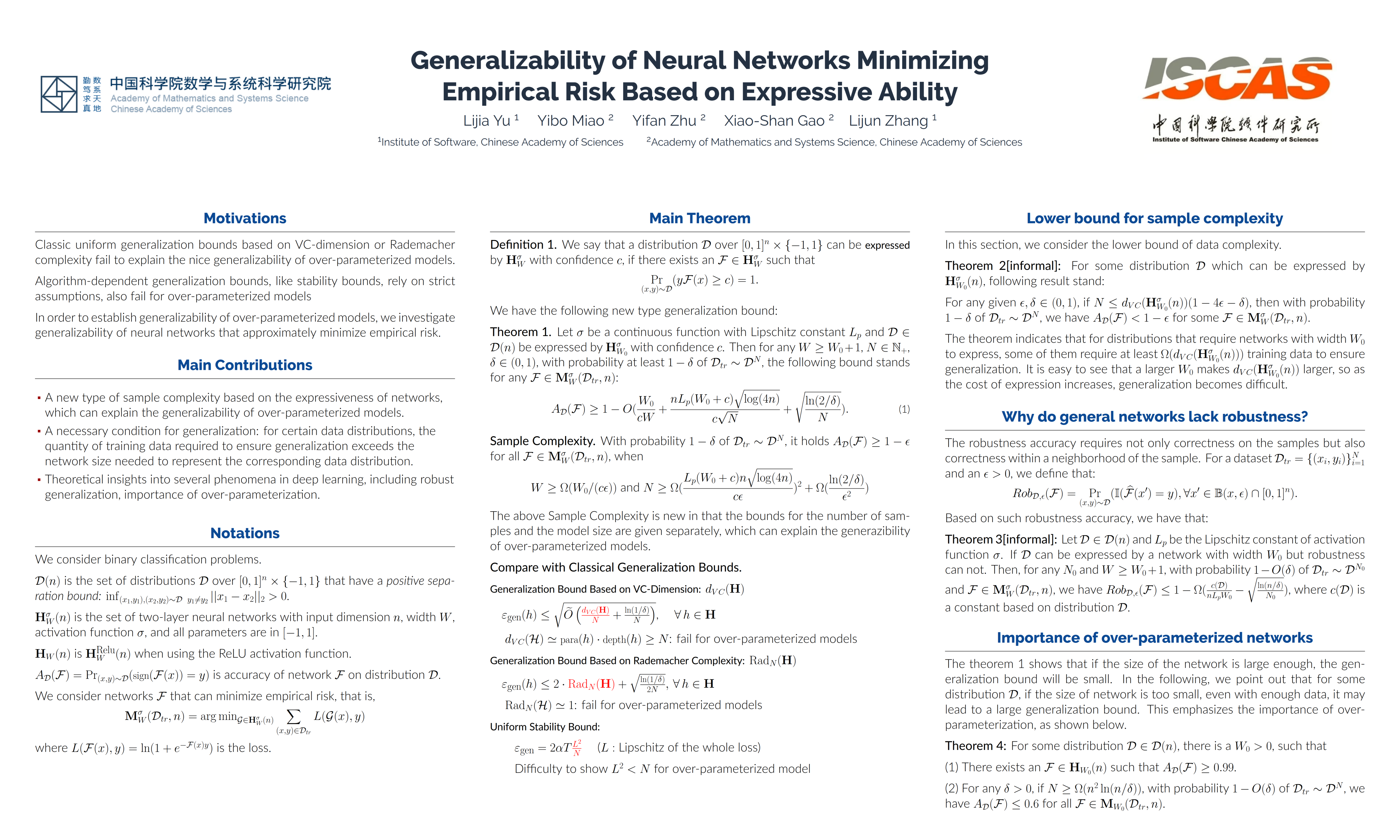The primary objective of learning methods is generalization. Classic generalization bounds, based on VC-dimension or Rademacher complexity, are uniformly applicable to all networks in the hypothesis space. On the other hand, algorithm-dependent generalization bounds, like stability bounds, address more practical scenarios and provide generalization conditions for neural networks trained using SGD. However, these bounds often rely on strict assumptions, such as the NTK hypothesis or convexity of the empirical loss, which are typically not met by neural networks. In order to establish generalizability under less stringent assumptions, this paper investigates generalizability of neural networks that minimize the empirical risk. A lower bound for population accuracy is established based on the expressiveness of these networks, which indicates that with adequately large training sample and network sizes, these networks can generalize effectively. Additionally, we provide a lower bound necessary for generalization, demonstrating that, for certain data distributions, the quantity of data required to ensure generalization exceeds the network size needed to represent that distribution. Finally, we provide theoretical insights into several phenomena in deep learning, including robust overfitting, importance of over-parameterization networks, and effects of loss functions.