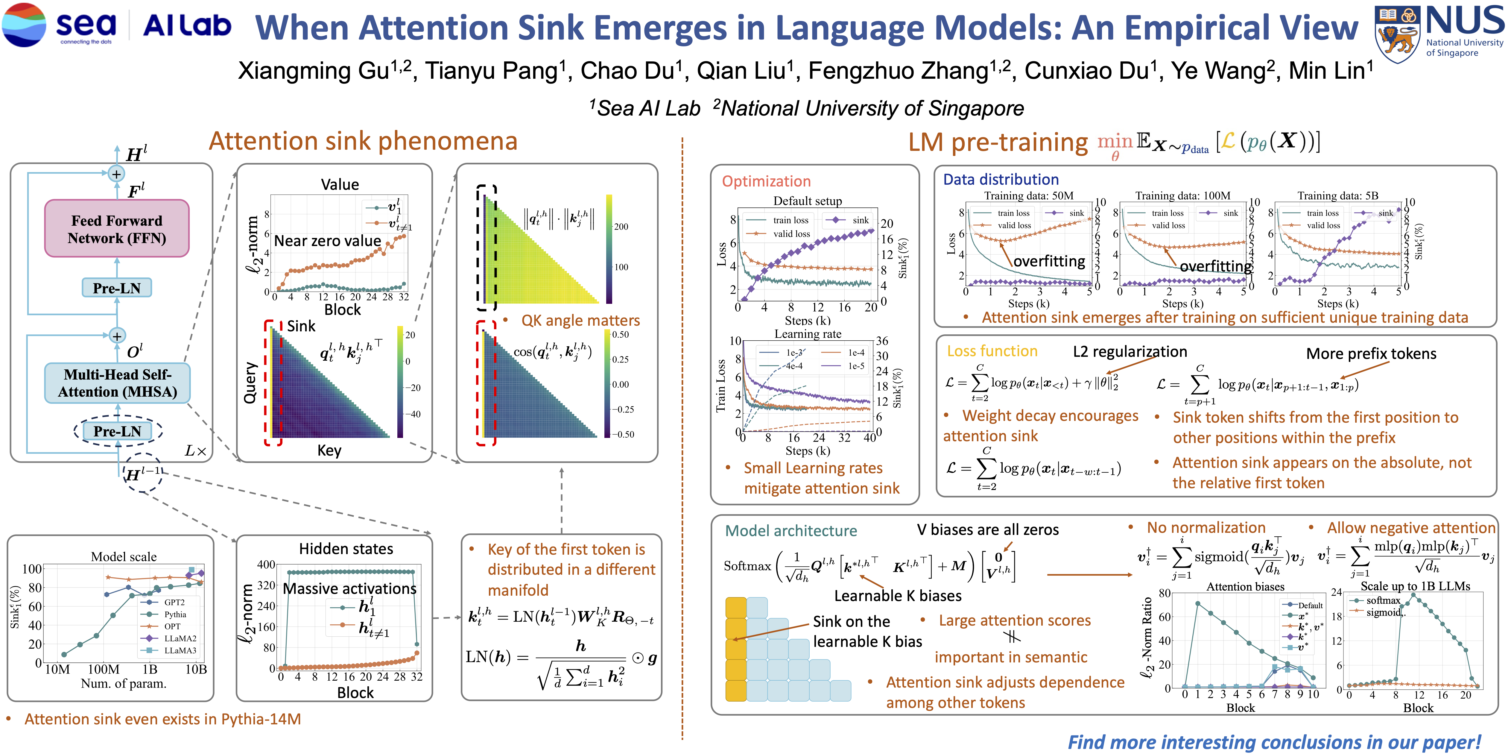Auto-regressive language Models (LMs) assign significant attention to the first token, even if it is not semantically important, which is known as attention sink. This phenomenon has been widely adopted in applications such as streaming/long context generation, KV cache optimization, inference acceleration, model quantization, and others. Despite its widespread use, a deep understanding of attention sink in LMs is still lacking. In this work, we first demonstrate that attention sinks exist universally in auto-regressive LMs with various inputs, even in small models. Furthermore, attention sink is observed to emerge during the LM pre-training, motivating us to investigate how optimization, data distribution, loss function, and model architecture in LM pre-training influence its emergence. We highlight that attention sink emerges after effective optimization on sufficient training data. The sink position is highly correlated with the loss function and data distribution. Most importantly, we find that attention sink acts more like key biases, storing extra attention scores, which could be non-informative and not contribute to the value computation. We also observe that this phenomenon (at least partially) stems from tokens' inner dependence on attention scores as a result of softmax normalization. After relaxing such dependence by replacing softmax attention with other attention operations, such as sigmoid attention without normalization, attention sinks do not emerge in LMs up to 1B parameters. The code is available at https://github.com/sail-sg/Attention-Sink.