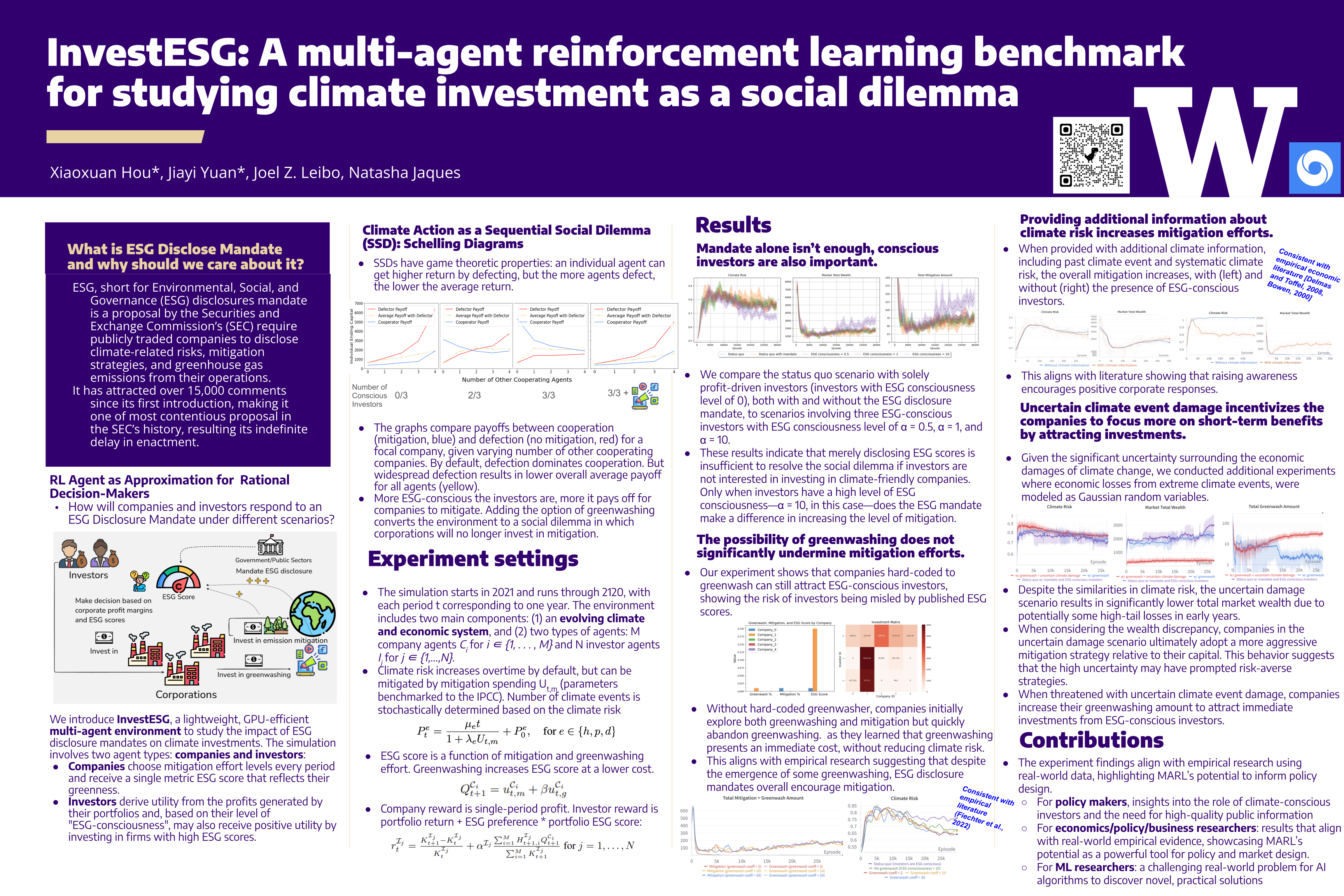InvestESG is a novel multi-agent reinforcement learning (MARL) benchmark designed to study the impact of Environmental, Social, and Governance (ESG) disclosure mandates on corporate climate investments. The benchmark models an intertemporal social dilemma where companies balance short-term profit losses from climate mitigation efforts and long-term benefits from reducing climate risk, while ESG-conscious investors attempt to influence corporate behavior through their investment decisions. Companies allocate capital across mitigation, greenwashing, and resilience, with varying strategies influencing climate outcomes and investor preferences. We are releasing open-source versions of InvestESG in both PyTorch and JAX, which enable scalable and hardware-accelerated simulations for investigating competing incentives in mitigate climate change. Our experiments show that without ESG-conscious investors with sufficient capital, corporate mitigation efforts remain limited under the disclosure mandate. However, when a critical mass of investors prioritizes ESG, corporate cooperation increases, which in turn reduces climate risks and enhances long-term financial stability. Additionally, providing more information about global climate risks encourages companies to invest more in mitigation, even without investor involvement. Our findings align with empirical research using real-world data, highlighting MARL's potential to inform policy by providing insights into large-scale socio-economic challenges through efficient testing of alternative policy and market designs.