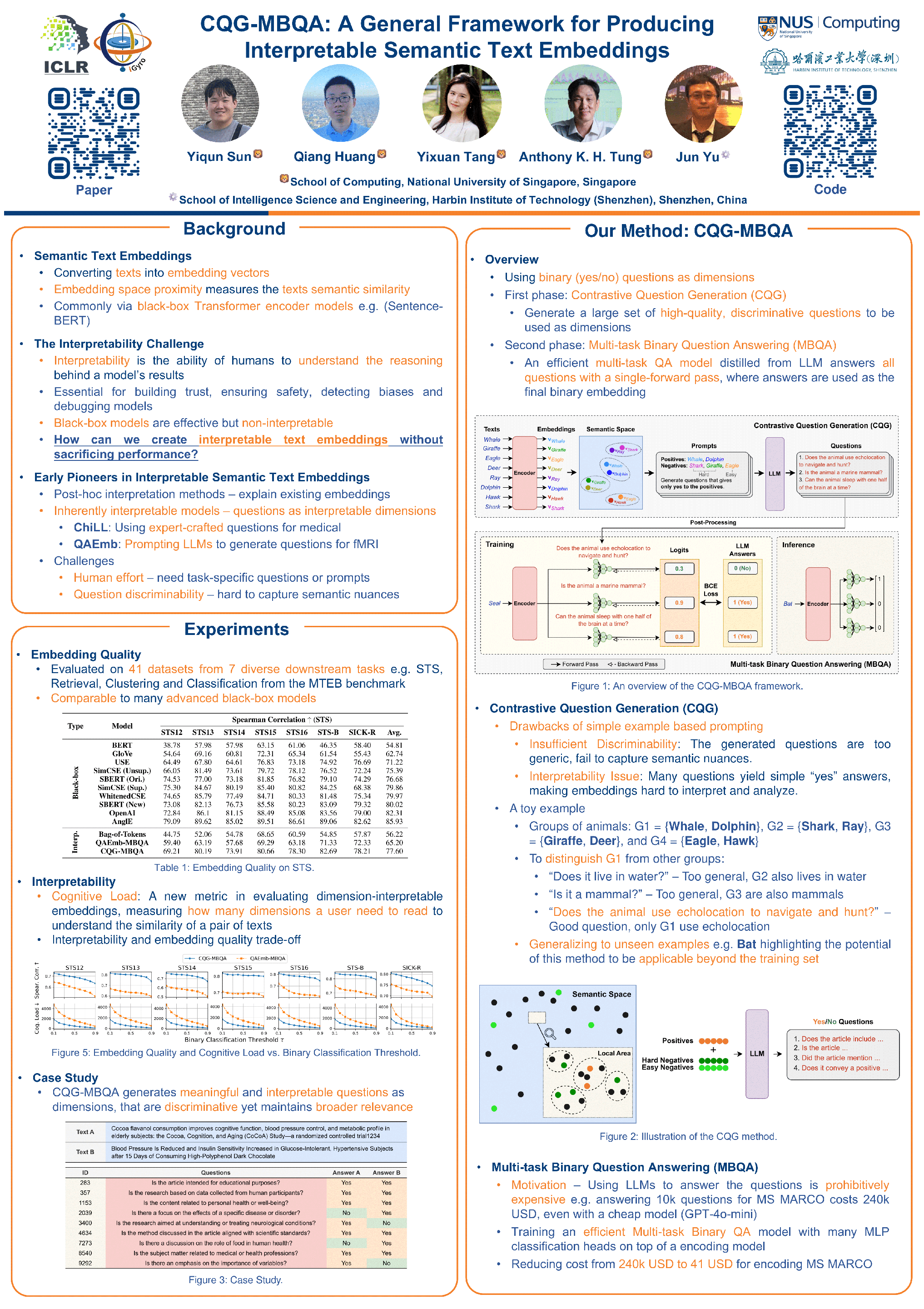 Semantic text embedding is essential to many tasks in Natural Language Processing (NLP). While black-box models are capable of generating high-quality embeddings, their lack of interpretability limits their use in tasks that demand transparency. Recent approaches have improved interpretability by leveraging domain-expert-crafted or LLM-generated questions, but these methods rely heavily on expert input or well-prompt design, which restricts their generalizability and ability to generate discriminative questions across a wide range of tasks. To address these challenges, we introduce \algo{CQG-MBQA} (Contrastive Question Generation - Multi-task Binary Question Answering), a general framework for producing interpretable semantic text embeddings across diverse tasks. Our framework systematically generates highly discriminative, low cognitive load yes/no questions through the \algo{CQG} method and answers them efficiently with the \algo{MBQA} model, resulting in interpretable embeddings in a cost-effective manner. We validate the effectiveness and interpretability of \algo{CQG-MBQA} through extensive experiments and ablation studies, demonstrating that it delivers embedding quality comparable to many advanced black-box models while maintaining inherently interpretability. Additionally, \algo{CQG-MBQA} outperforms other interpretable text embedding methods across various downstream tasks. The source code is available at \url{https://github.com/dukesun99/CQG-MBQA}.