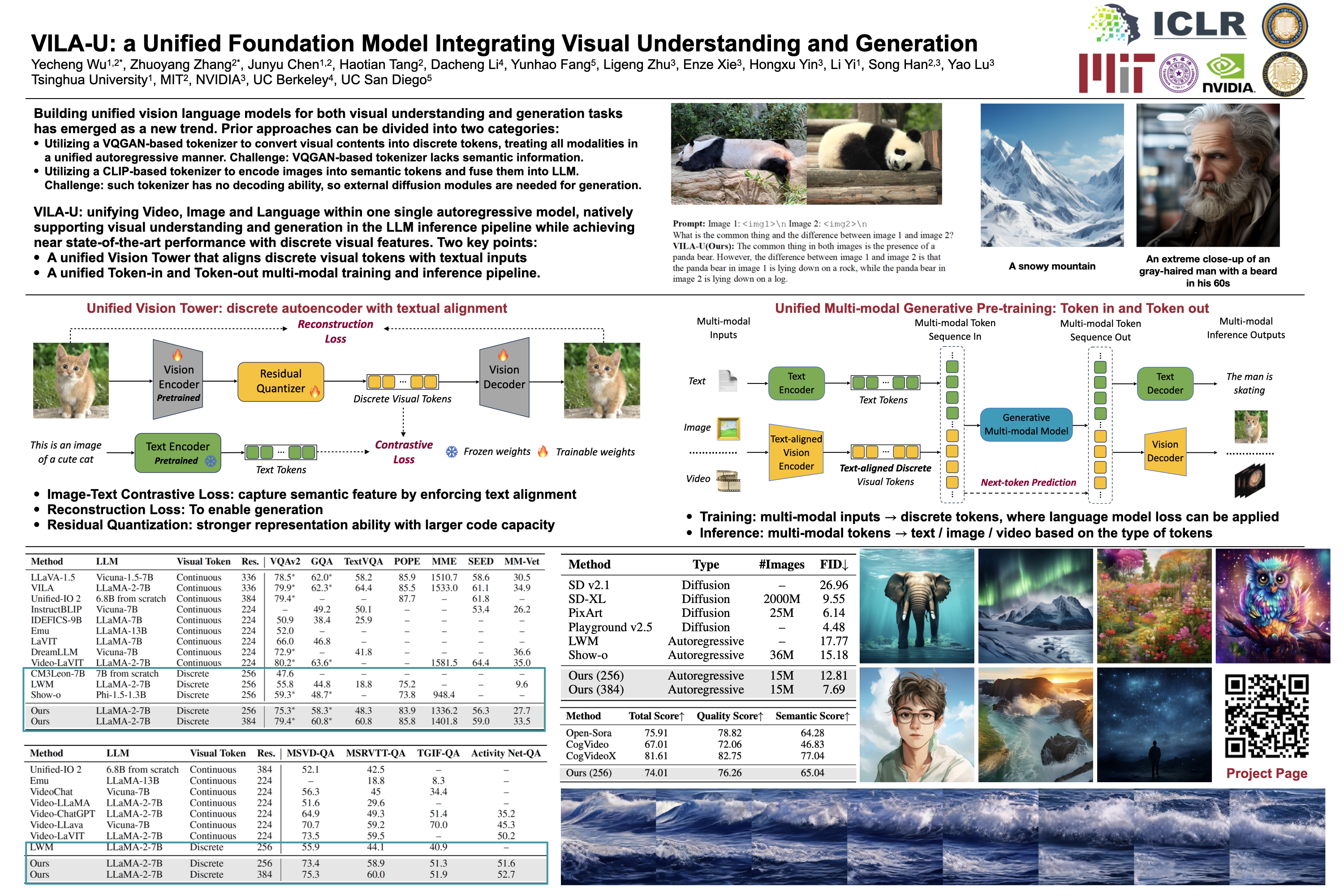 VILA-U is a Unified foundation model that integrates Video, Image, Language understanding and generation. Traditional visual language models (VLMs) use separate modules for understanding and generating visual content, which can lead to misalignment and increased complexity. In contrast, VILA-U employs a single autoregressive next-token prediction framework for both tasks, eliminating the need for additional components like diffusion models. This approach not only simplifies the model but also achieves near state-of-the-art performance in visual language understanding and generation. The success of VILA-U is attributed to two main factors: the unified vision tower that aligns discrete visual tokens with textual inputs during pretraining, which enhances visual perception, and autoregressive image generation can achieve similar quality as diffusion models with high-quality dataset. This allows VILA-U to perform comparably to more complex models using a fully token-based autoregressive framework.