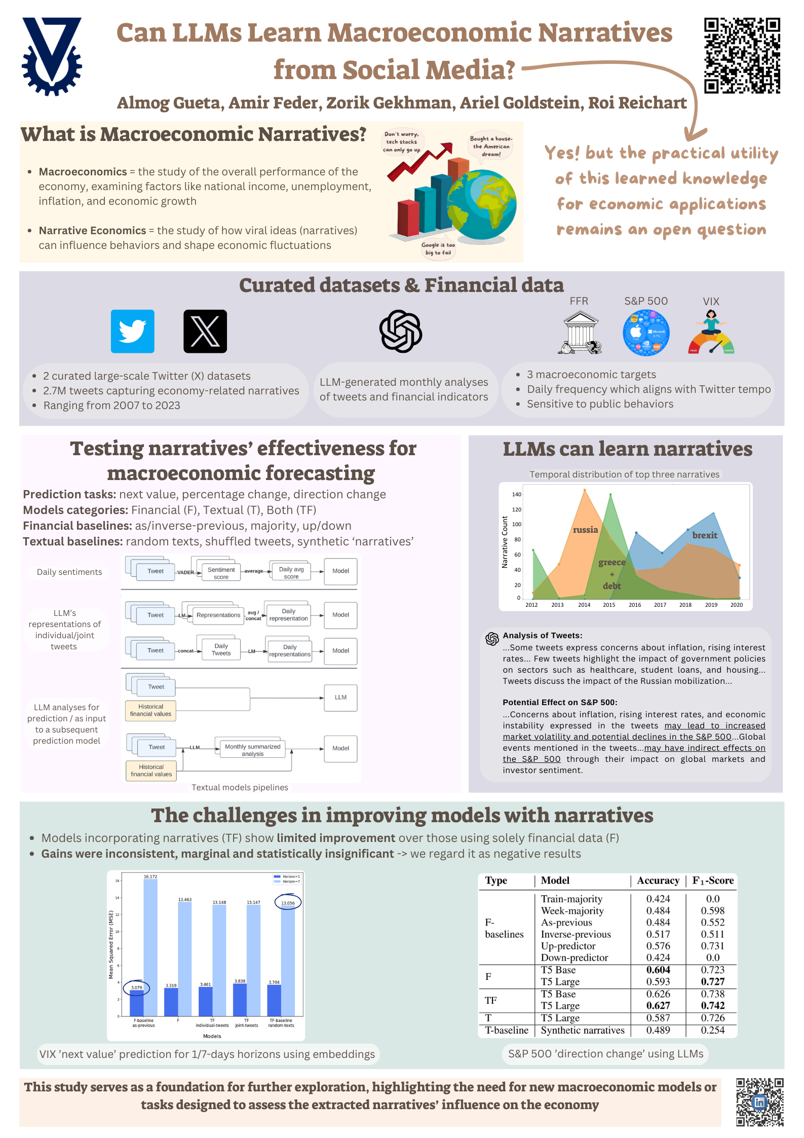 Can we predict the macroeconomy by analyzing the narratives people share on social media? We dove deep into the world of Narrative Economics, using NLP models to analyze millions of viral tweets and see if they could help us predict the fluctuations of macroeconomic indicators. 🚨 Spoiler alert: it's not that easy! Join us as we explore the interesting relationship between narratives, social media, and macroeconomy, and uncover the challenges of turning narratives into treasure.