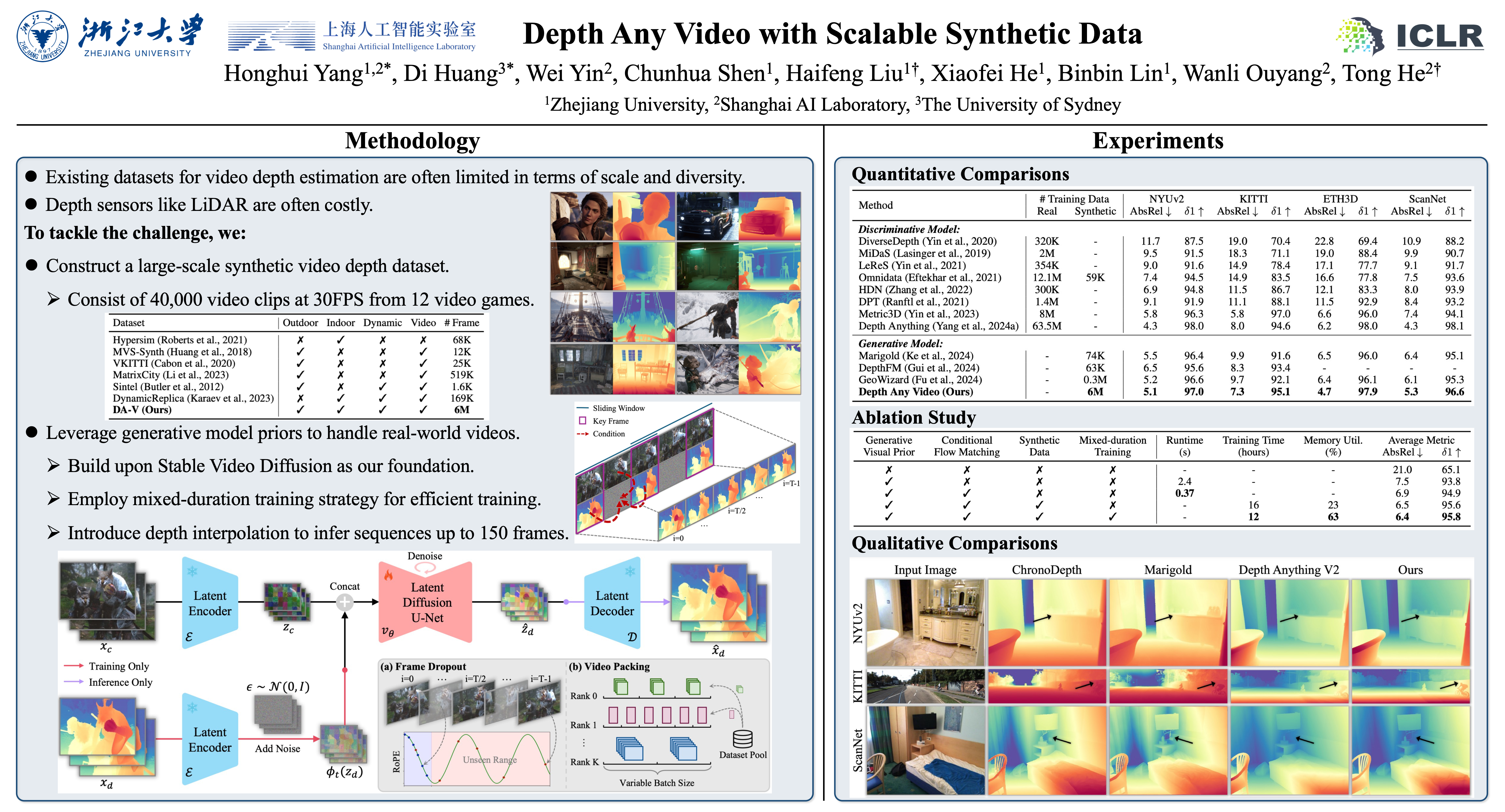 Video depth estimation has long been hindered by the scarcity of consistent and scalable ground truth data, leading to inconsistent and unreliable results. In this paper, we introduce Depth Any Video, a model that tackles the challenge through two key innovations. First, we develop a scalable synthetic data pipeline, capturing real-time video depth data from diverse virtual environments, yielding 40,000 video clips of 5-second duration, each with precise depth annotations. Second, we leverage the powerful priors of generative video diffusion models to handle real-world videos effectively, integrating advanced techniques such as rotary position encoding and flow matching to further enhance flexibility and efficiency. Unlike previous models, which are limited to fixed-length video sequences, our approach introduces a novel mixed-duration training strategy that handles videos of varying lengths and performs robustly across different frame rates—even on single frames. At inference, we propose a depth interpolation method that enables our model to infer high-resolution video depth across sequences of up to 150 frames. Our model outperforms all previous generative depth models in terms of spatial accuracy and temporal consistency. The code and model weights are open-sourced.